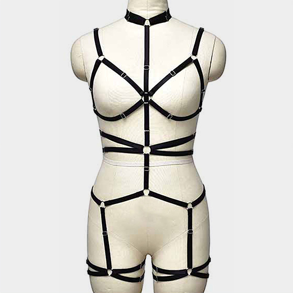 Details • Size : One Size Fits Most • Stretchable • Command attention in this bold full body cage harness lingerie, designed to sculpt and accentuate every curve. Crafted with a series of sleek, adjustable black straps, this piece offers a customizable fit that hugs your figure from bust to thighs. The structured design features a choker neckline, waist cincher accents, and thigh garter harnesses, perfect for elevating your lingerie game or adding edge to festival or rave looks. Ideal for layering or wearing solo, this bondage-inspired bodysuit delivers ultimate empowerment and fierce fashion in one.