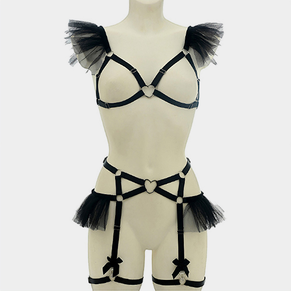 Metal Open Heart Hardware, Mesh Ruffle Bow Detail Flirty Lingerie Harness Set