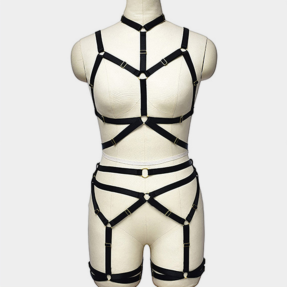 Metal Ring Accented Elastic Strap Full Body Harness Lingerie Set