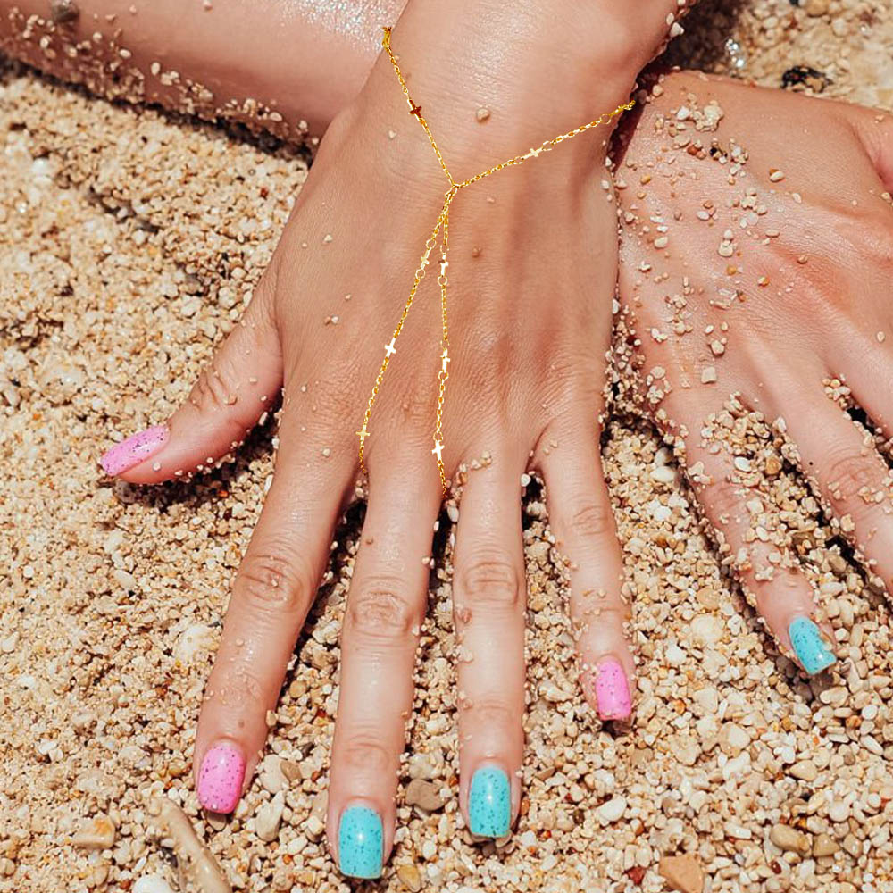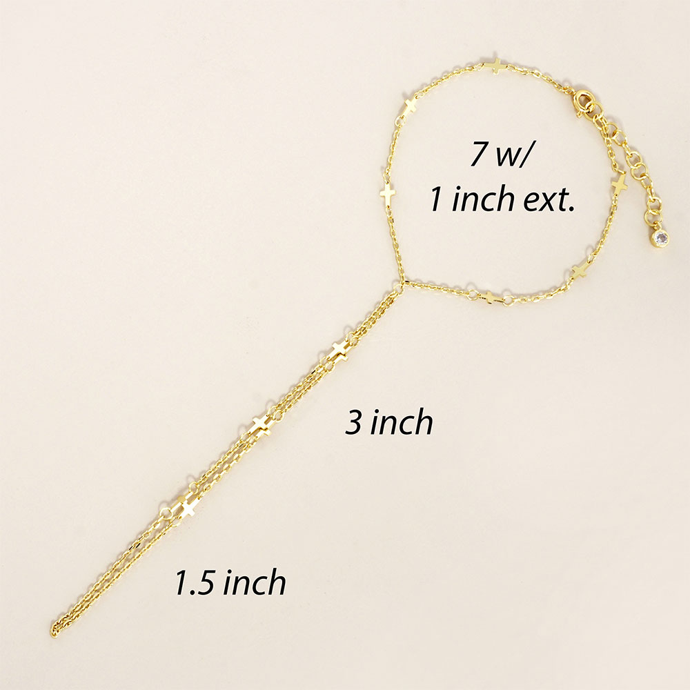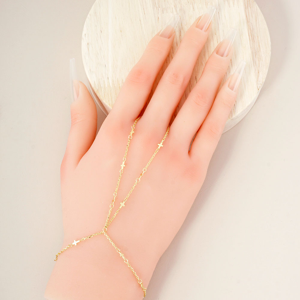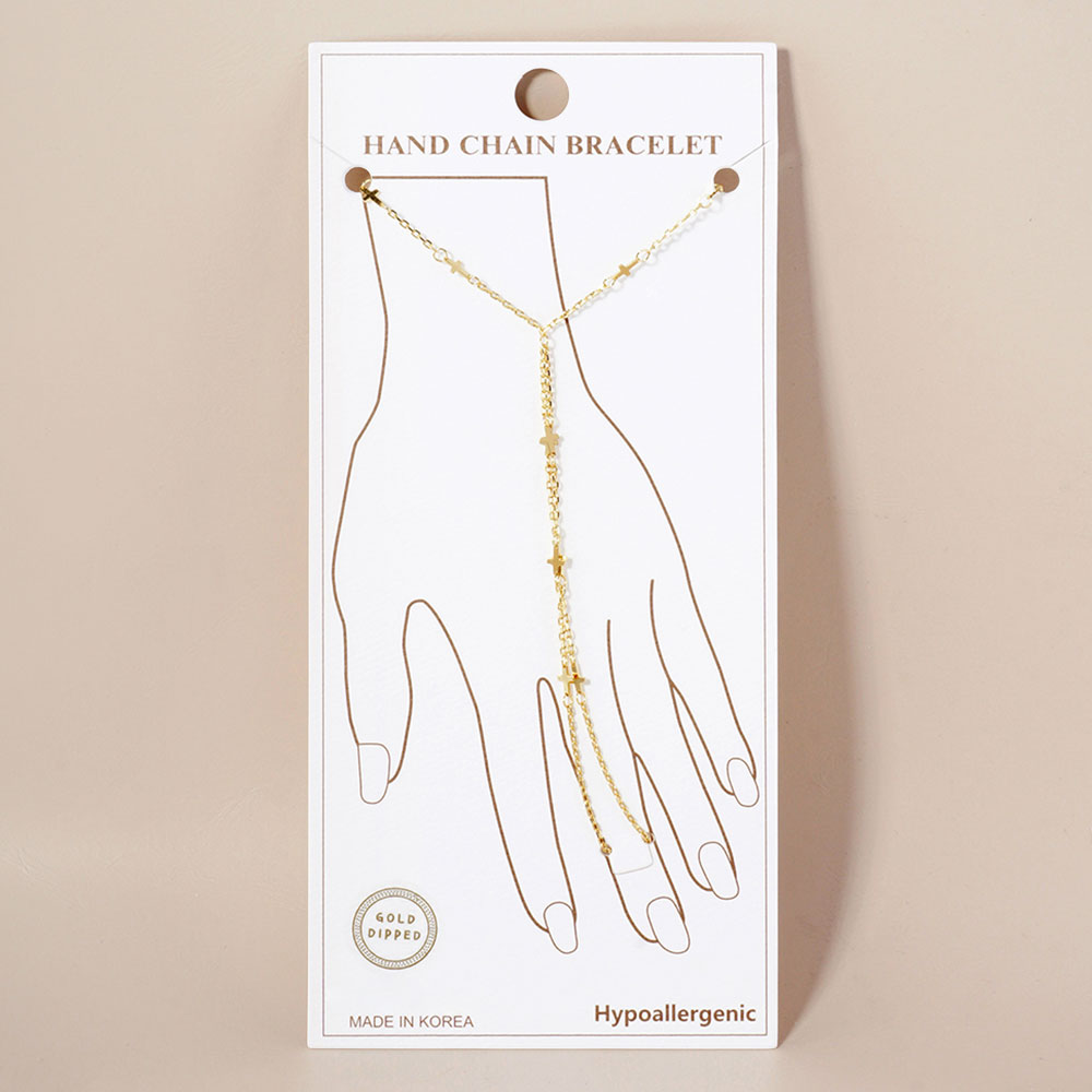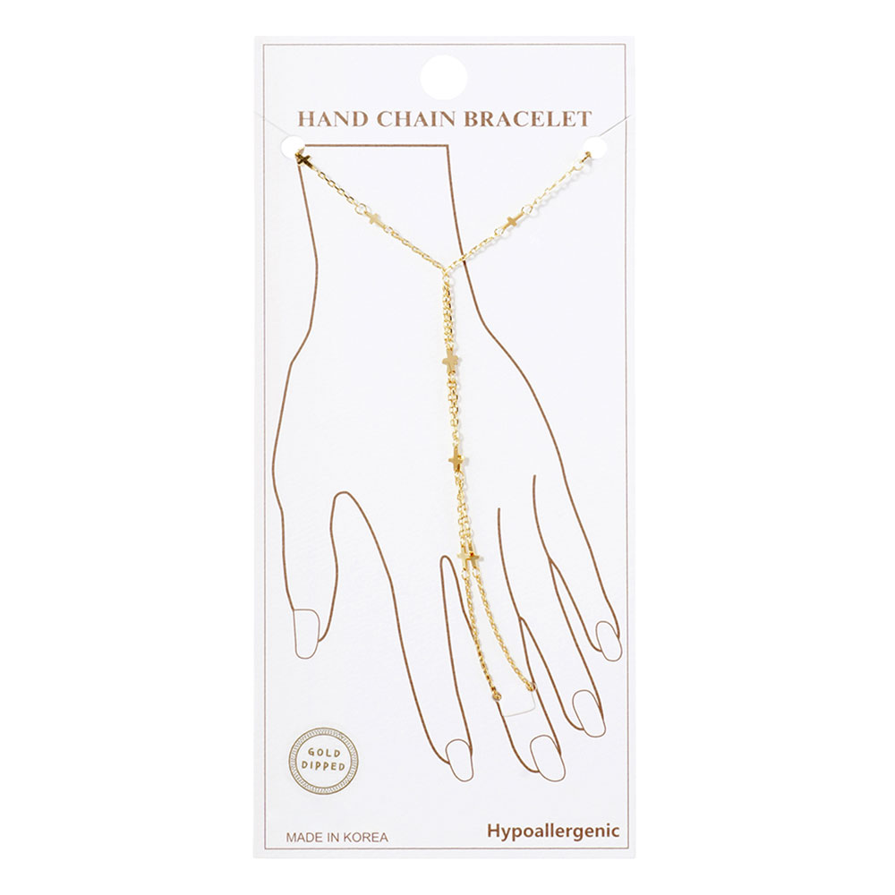 Details • Bracelet Size : 7" + 1" L, 3" H • Ring Size: Free • Elegant hand chain bracelet featuring a delicate cross design. Ideal for everyday wear or special occasions. Made with attention to quality and style. • Lead and Nickel Compliant • Hypoallergenic • Made In Korea • Gold Dipped