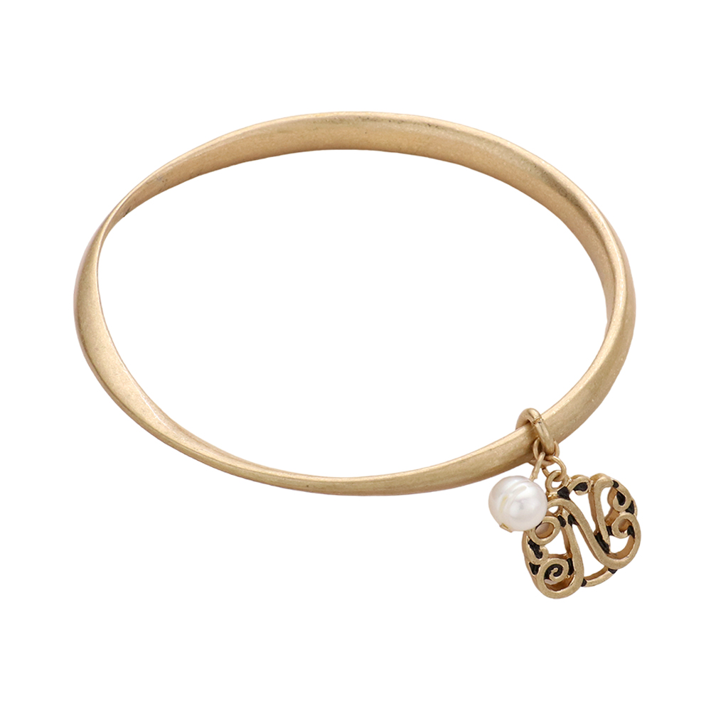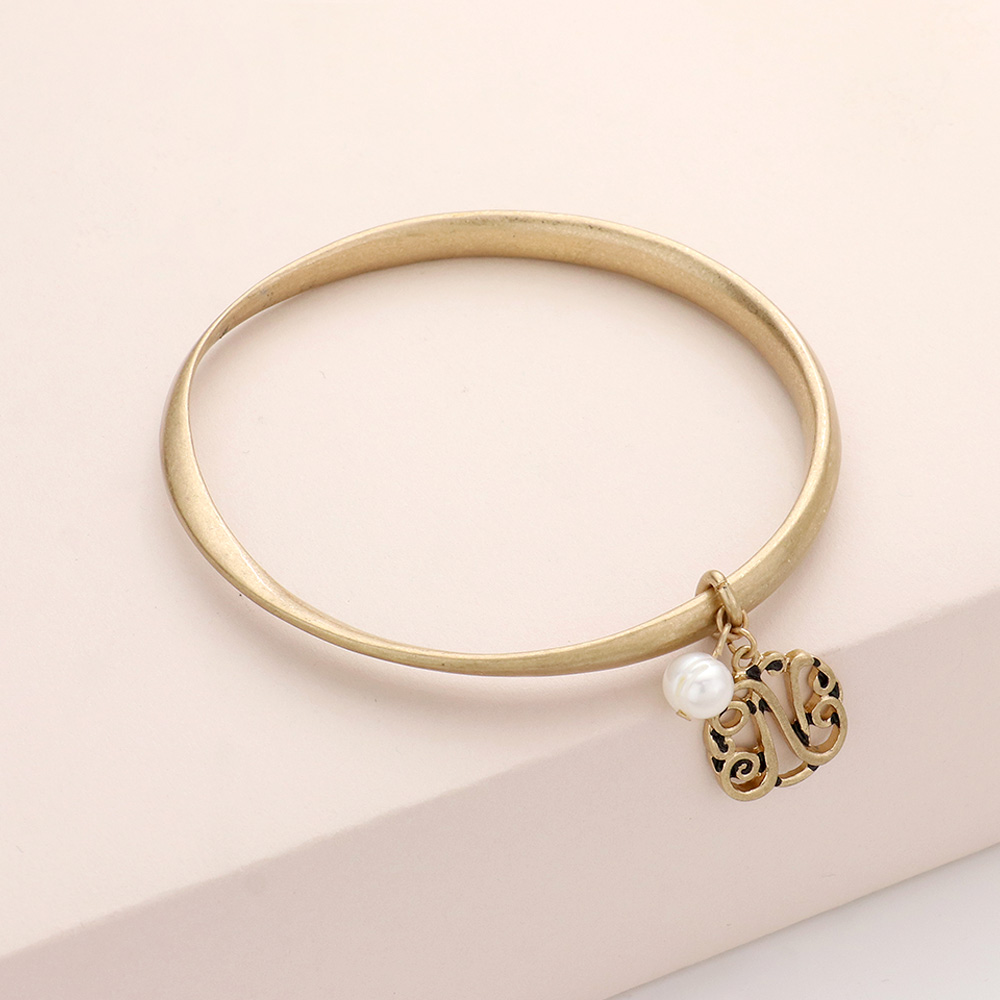 -N- Initial Monogram Pearl Charm Bangle Bracelet