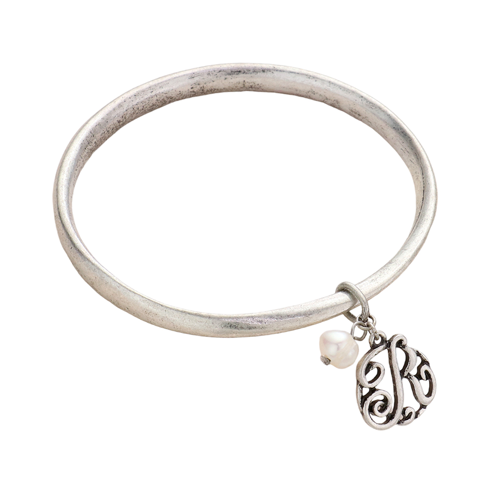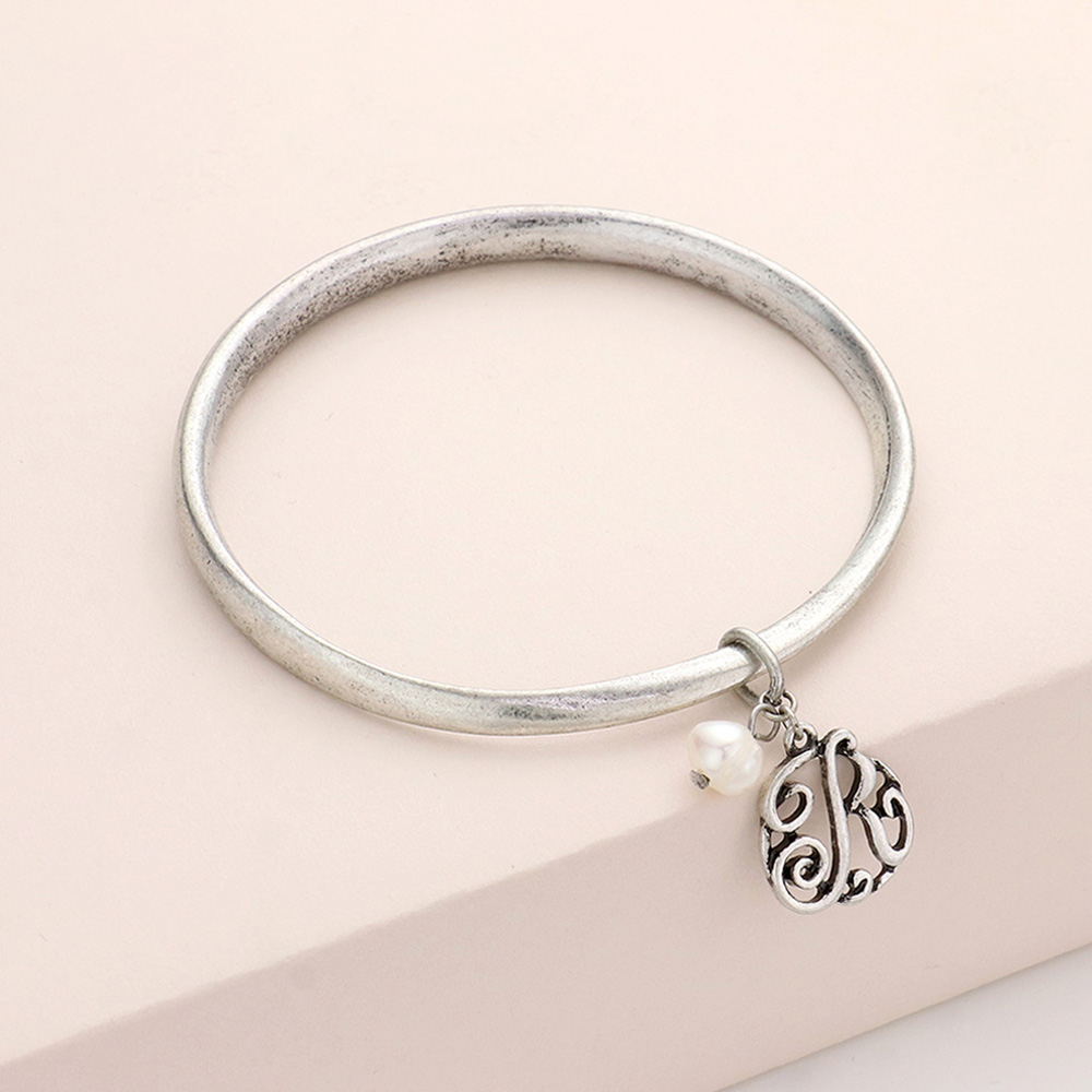 -R- Initial Monogram Pearl Charm Bangle Bracelet