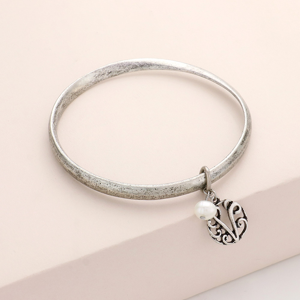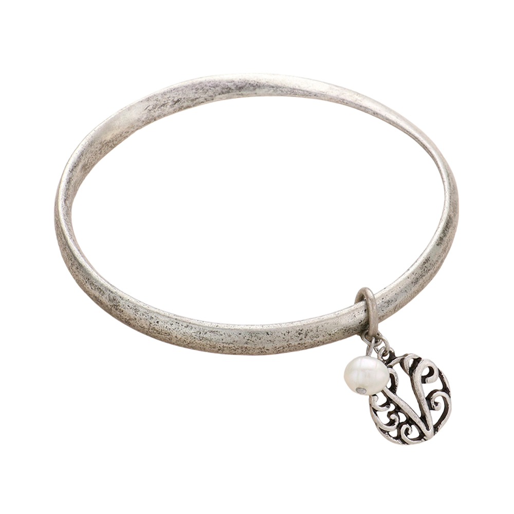 -V- Initial Monogram Pearl Charm Bangle Bracelet