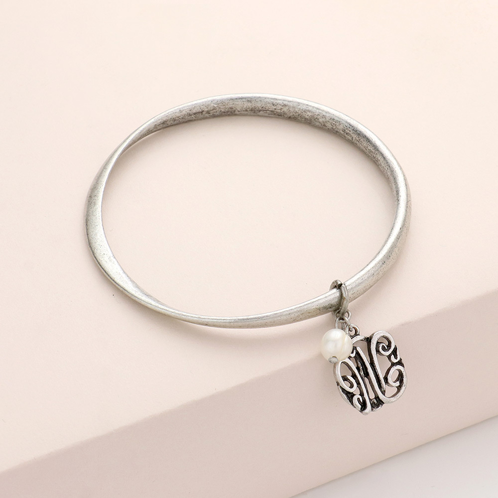 -V- Initial Monogram Pearl Charm Bangle Bracelet