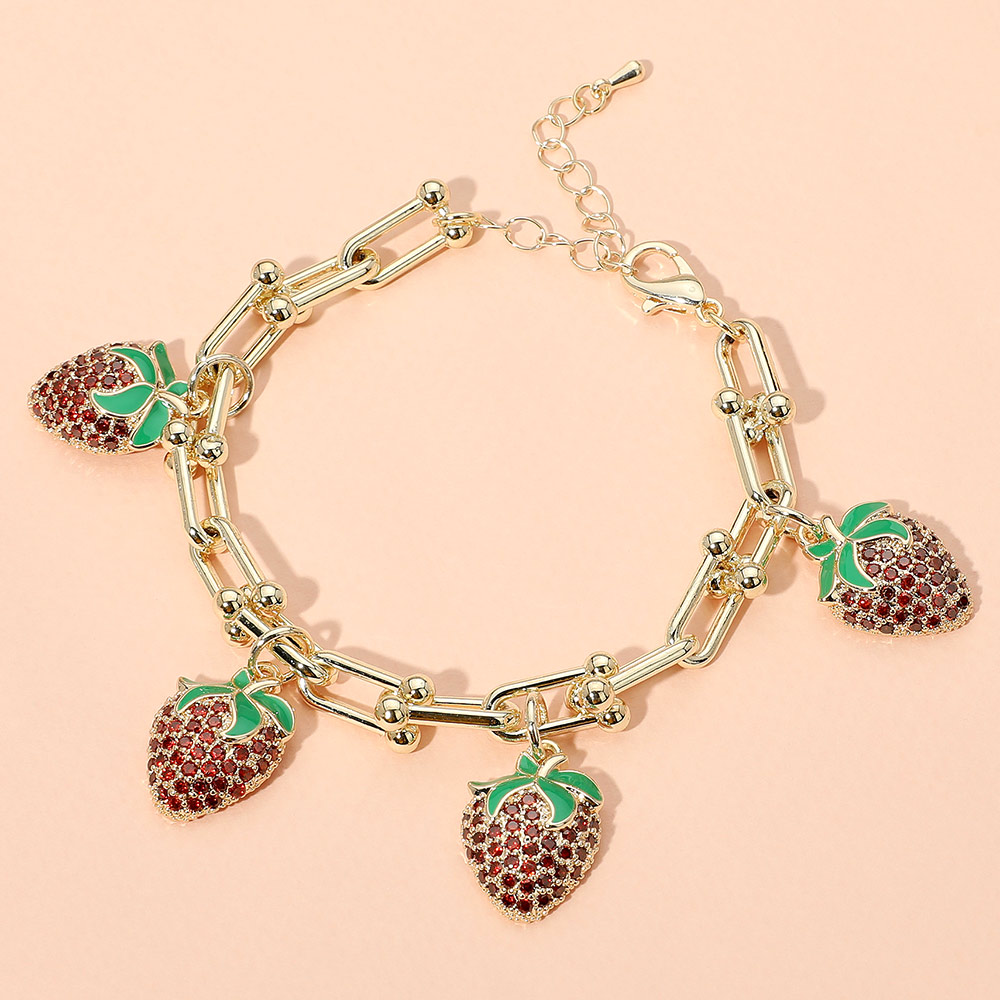 14K Gold Plated CZ Stone Paved Strawberry Charm Station Hardware Chain Bracelet