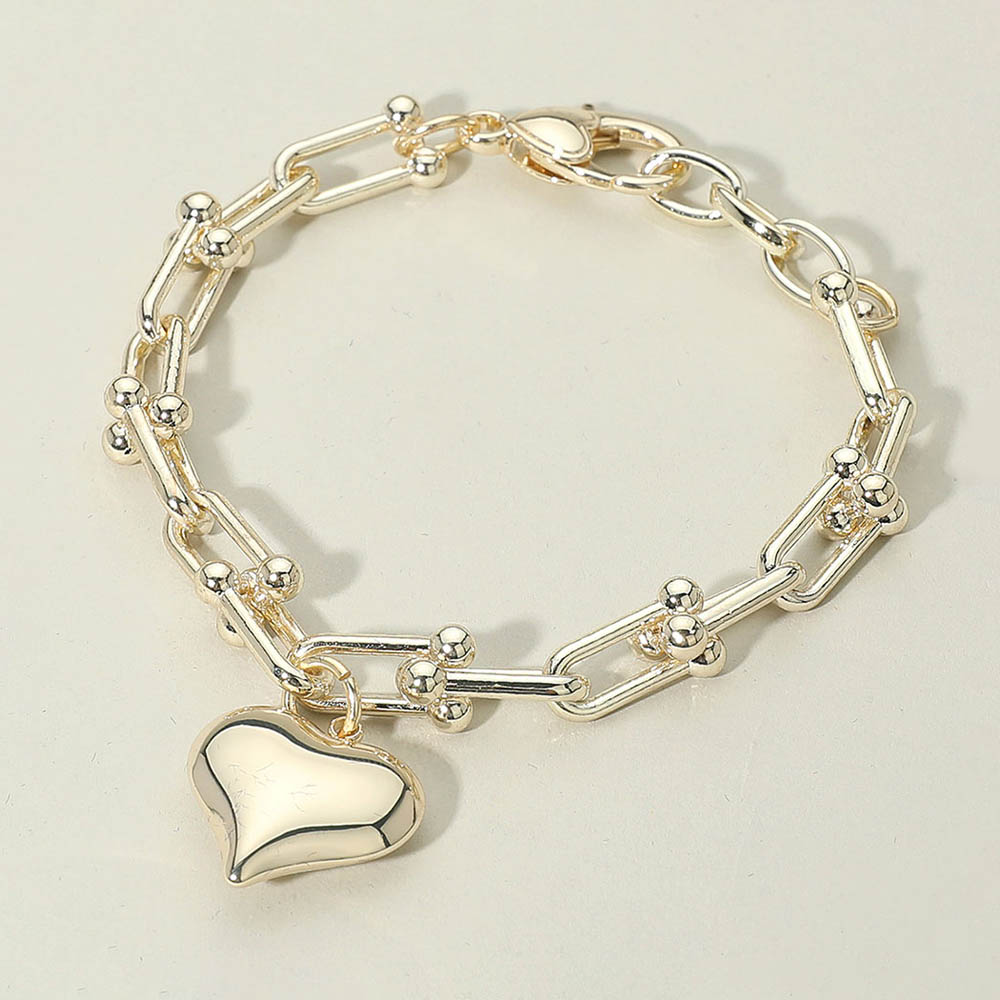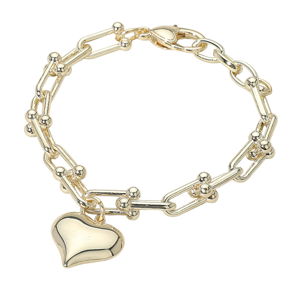 Details • Size : 0.4" H, 7.5" + 1" L • Charm Size : 0.8" X 0.75" • Lobster Clasp Closure • Chic chain link bracelet adorned with a polished heart charm, blending modern style with a touch of romance. Lightweight and versatile, this bracelet is perfect for layering or wearing solo, making it a thoughtful gift or everyday accessory that adds elegance and charm to any outfit. • Gold Dipped