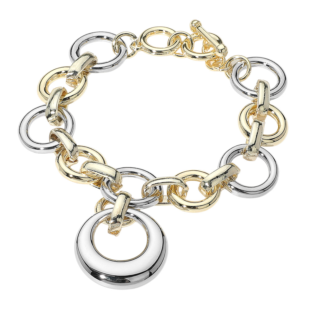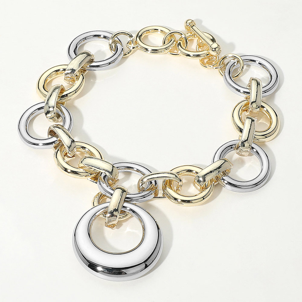 Details • Size : 1.75" H, 7.5" + 1" L • Toggle Closure • Modern two-tone bracelet featuring interlocking circle links and a bold statement pendant. Eye-catching yet versatile, this design adds a chic touch to casual and formal outfits, making it a perfect everyday accessory or thoughtful gift. • Gold Dipped