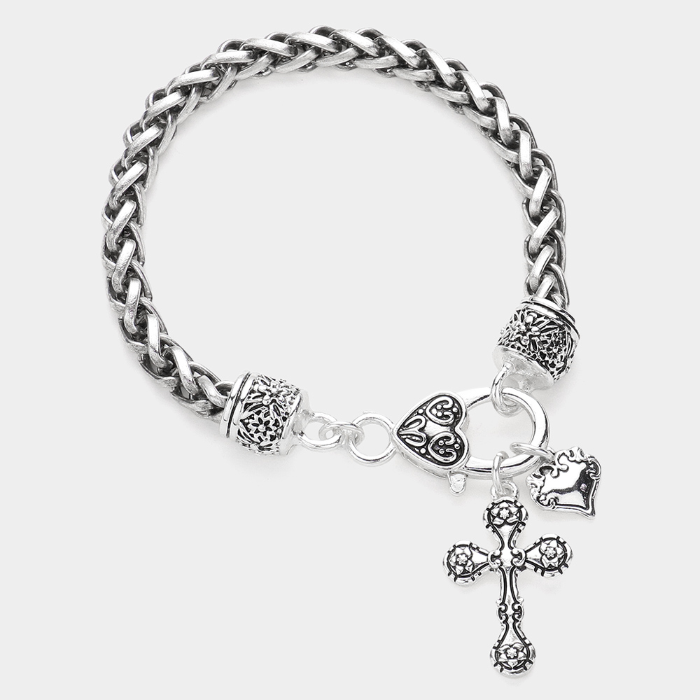 Antique Metal Cross Heart Charm Bracelet