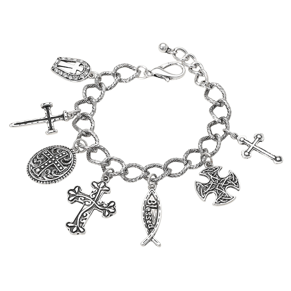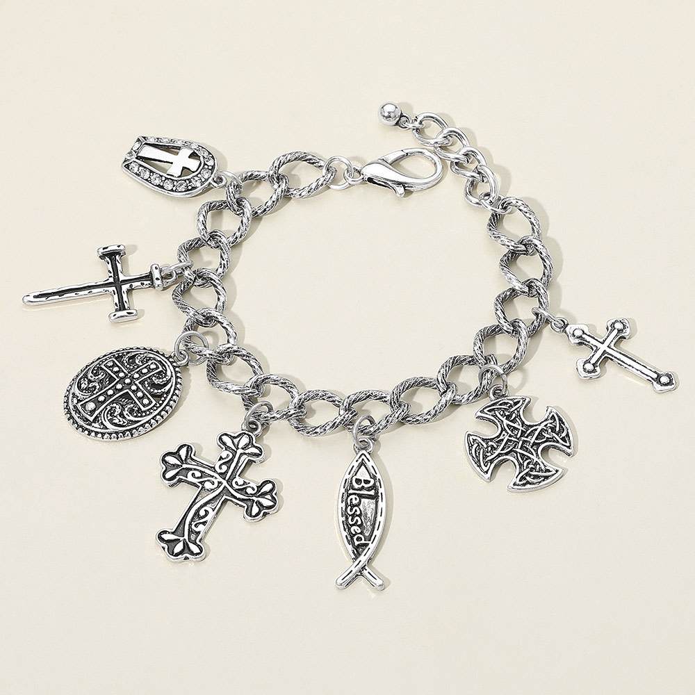 Details • Size : 1.8" H, 7.25" + 1.25" L • Lobster Clasp Closure • Chunky chain bracelet adorned with multiple symbolic charms including crosses, a fish, and engraved medallions. A meaningful accessory perfect for expressing personal beliefs and adding unique style to any outfit. • Lead and Nickel Compliant