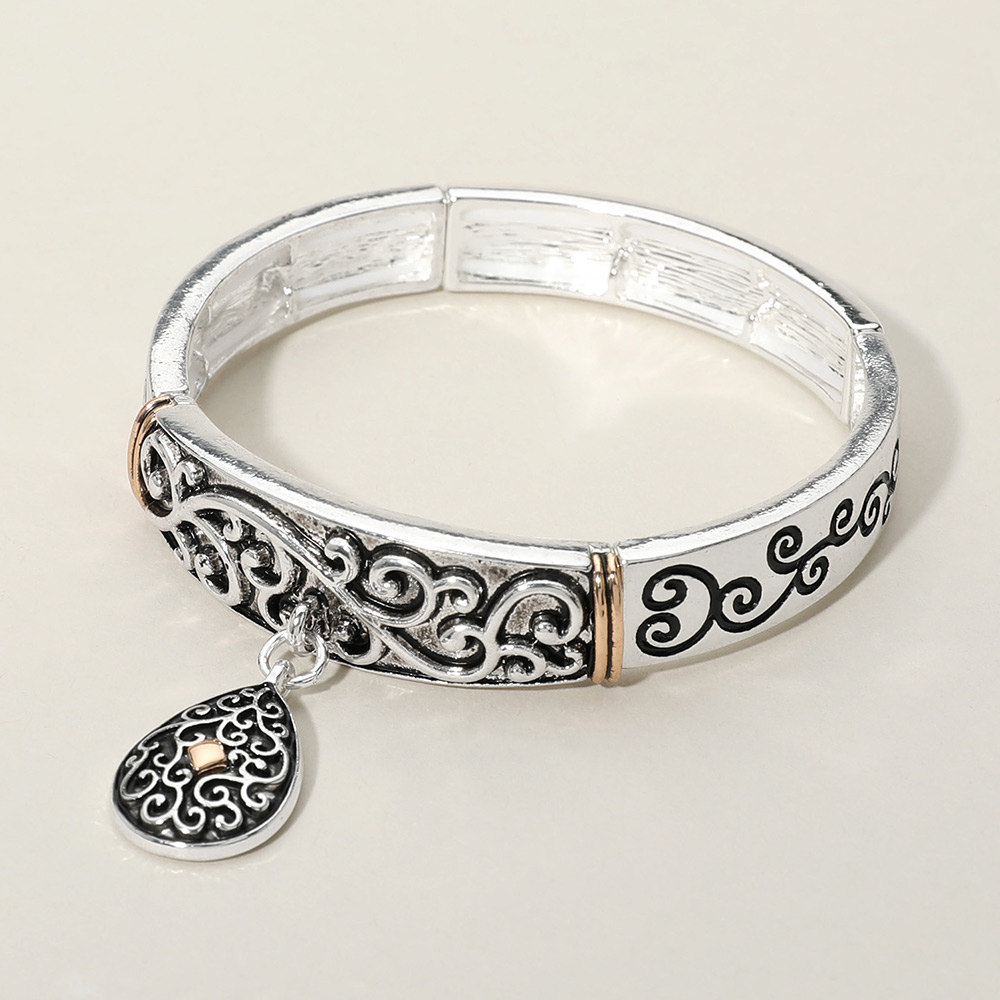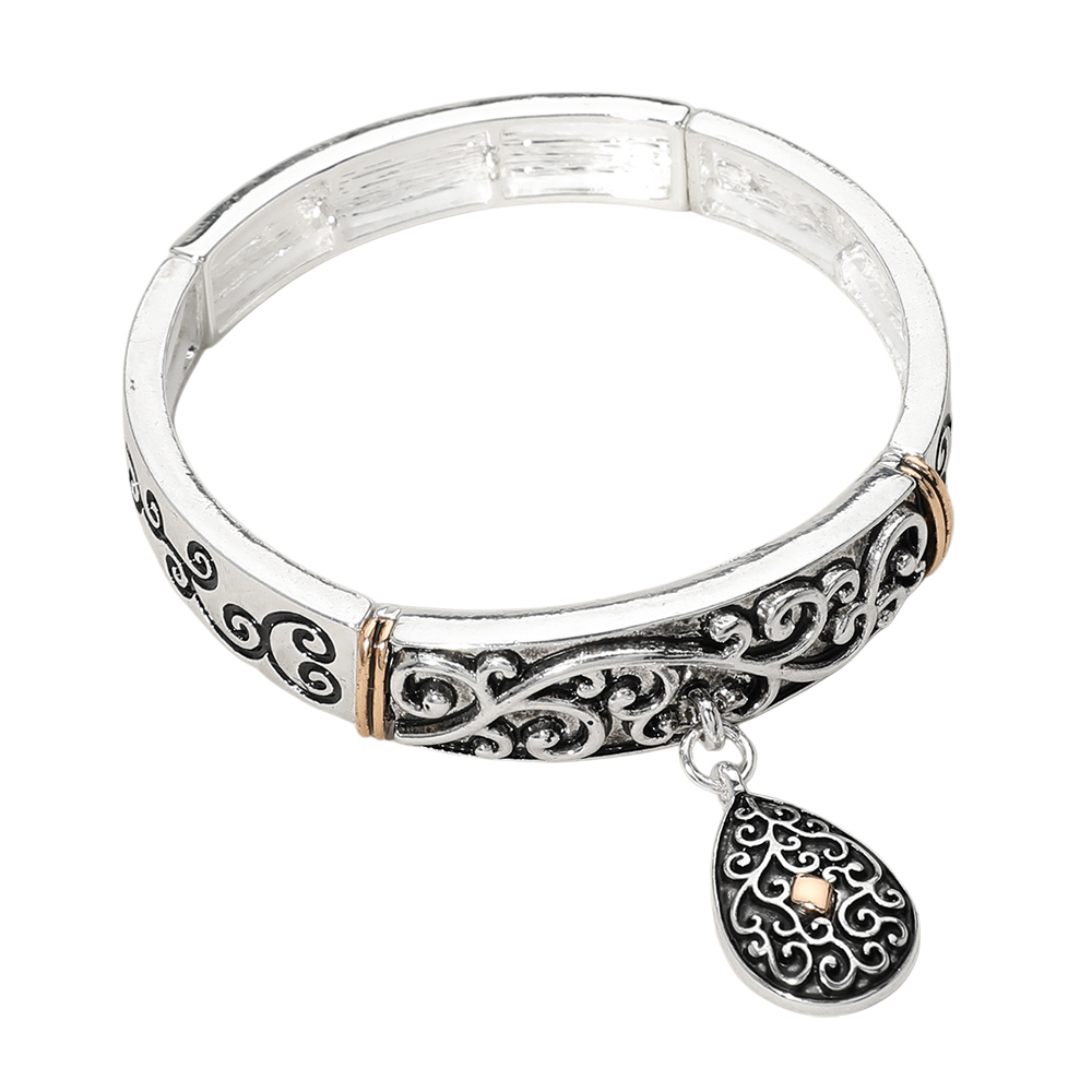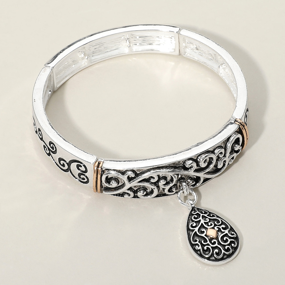 • Embrace timeless elegance with this vintage-inspired stretch bracelet featuring intricate filigree patterns and a dangling teardrop charm. Designed for effortless wear and versatile styling, it adds a sophisticated touch to casual and formal outfits, making it a unique accessory for any occasion.