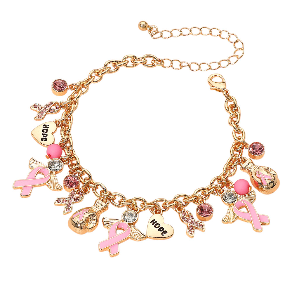Details • Size : 1.1" H, 7.5" + 3" L • Lobster Clasp Closure • Inspirational charm bracelet featuring awareness ribbon motifs, heart-shaped charms engraved with “Hope,” and sparkling bead accents. Designed to symbolize strength and support, this meaningful accessory is perfect for everyday wear or as a thoughtful gift to raise awareness. • Lead and Nickel Compliant