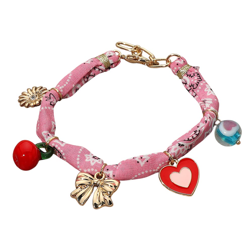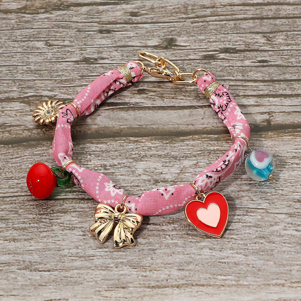 • Fun fabric-wrapped bracelet adorned with colorful charms including a heart, bow, cherry, flower, and bead. Perfect for adding a cheerful bohemian vibe to casual looks or gifting to charm jewelry lovers.