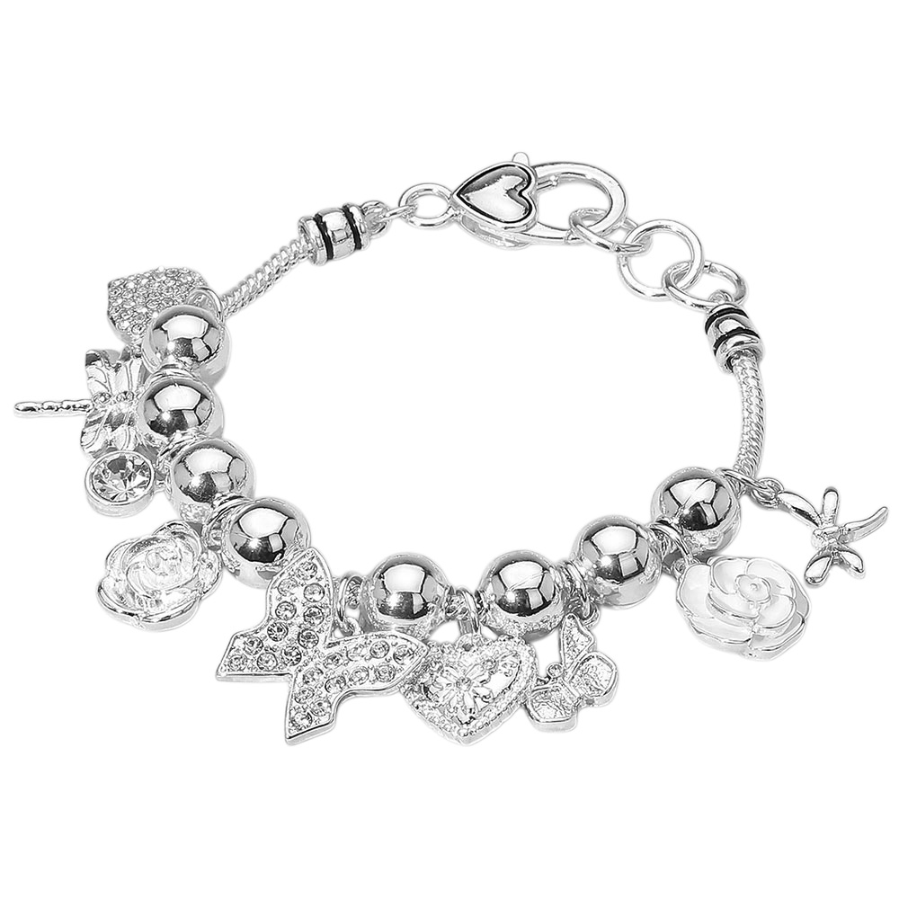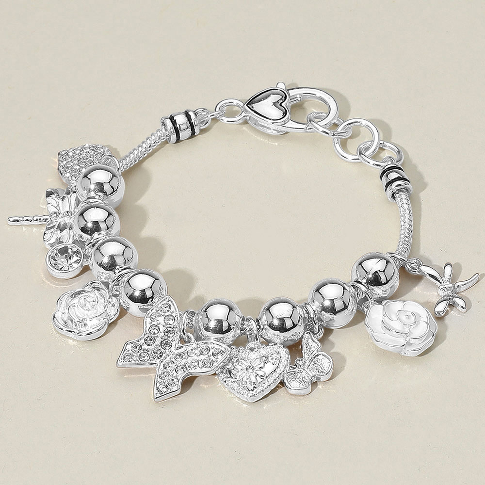 Details • Size : 0.25" H, 7.25" + 1" L • Charm Size : 0.8" L • Lobster Clasp Closure • Elegant charm bracelet featuring butterfly, heart, and floral designs with shimmering bead details. A beautiful statement piece for special events or everyday wear. Makes a thoughtful and stylish gift. • Lead and Nickel Compliant