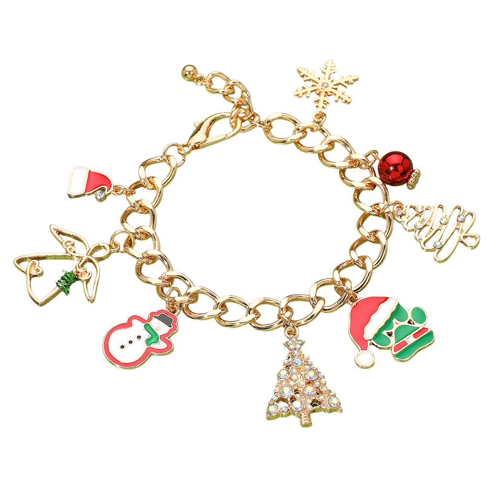 Details • Size : 1.25" H, 7.25" + 1" L • Lobster Clasp Closure • Celebrate the season with this festive Christmas charm bracelet featuring playful holiday icons like snowmen, trees, mittens, and bells. A cheerful accessory perfect for parties, gifting, or spreading joy. • Lead and Nickel Compliant