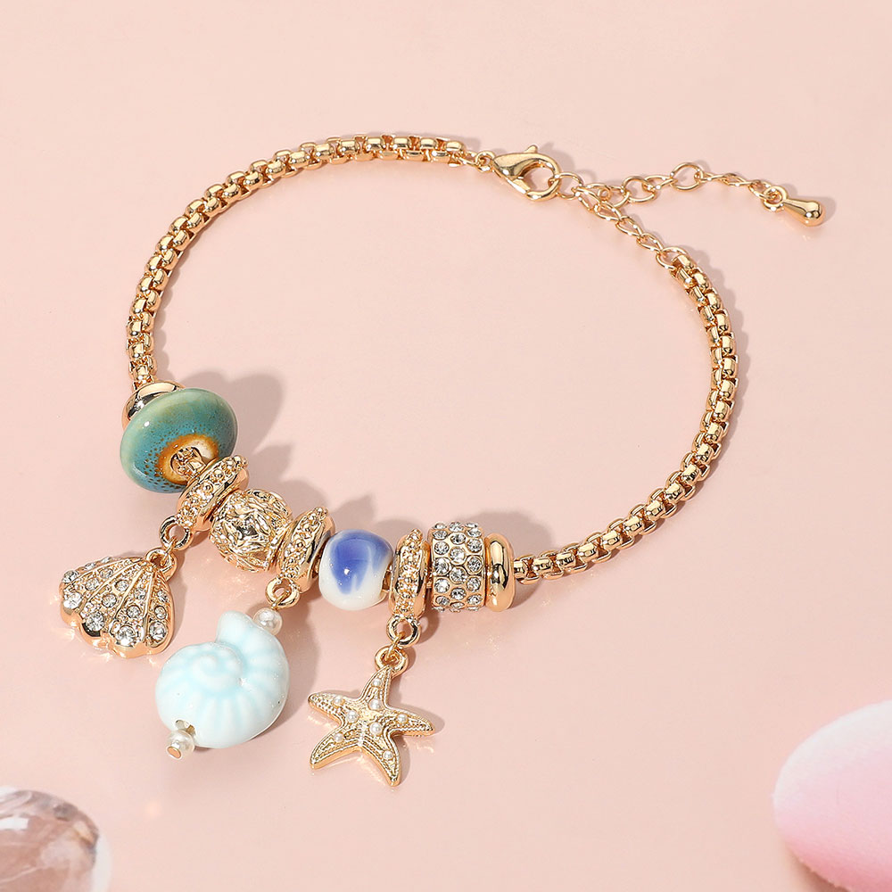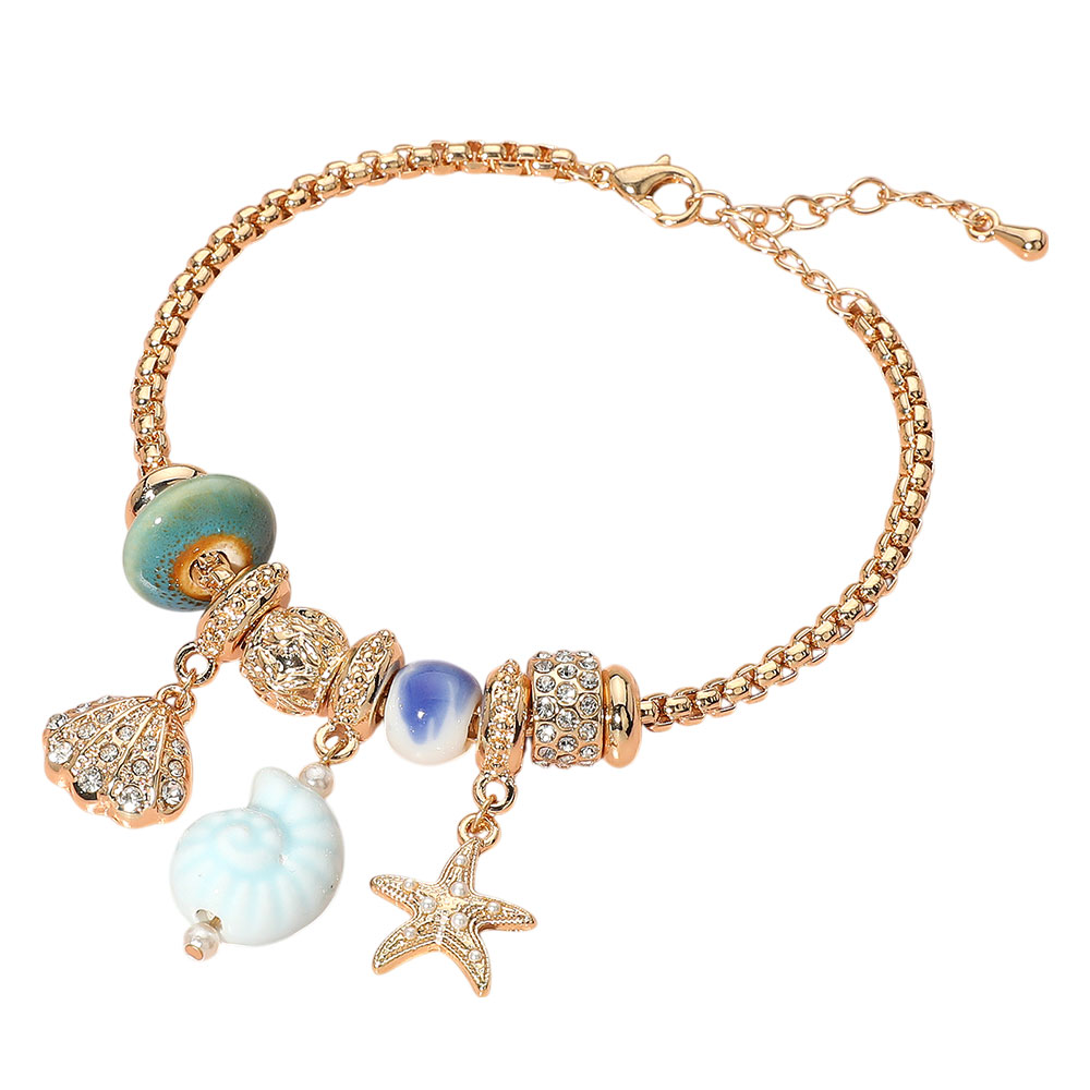 Details • Size : 0.1" H, 7" + 2" L • Charm Size : 1.3" L • Capture coastal vibes with this stunning gold charm bracelet featuring ocean-inspired pendants like a starfish, seashell, and sea snail. Accented with shimmering beads and crystals, this adjustable bracelet adds seaside elegance to any summer or vacation outfit. • Lead and Nickel Compliant