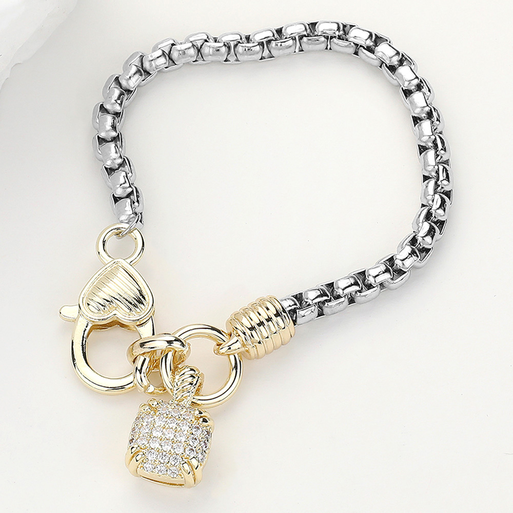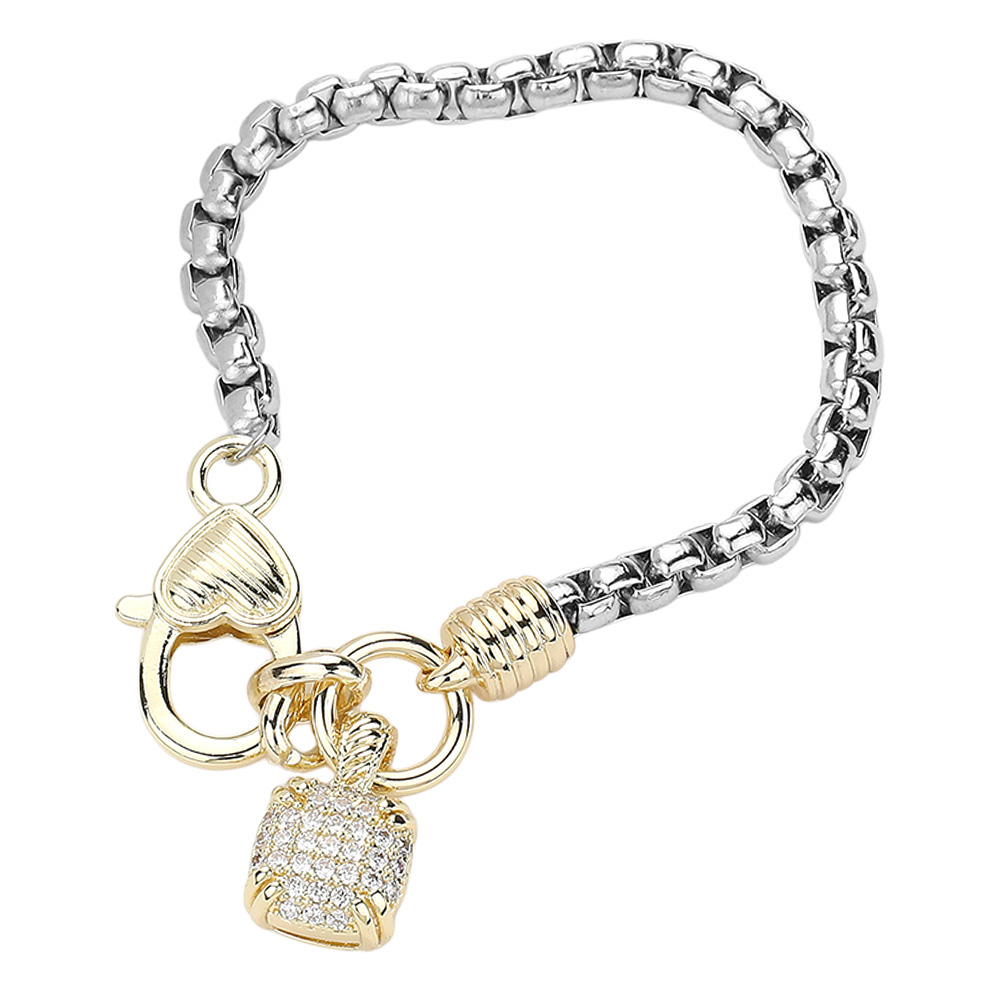 Details • Size : 7.5" + 0.5" L • Charm Size : 0.5" X 0.8" • Lobster Clasp Closure • Stylish box link bracelet accented with a sparkling pave lock charm and secure lobster clasp. A chic design that balances elegance with modern flair, making it a versatile accessory for layering or solo wear. Perfect for gifting or elevating everyday style. • CZ Cubic Zirconia