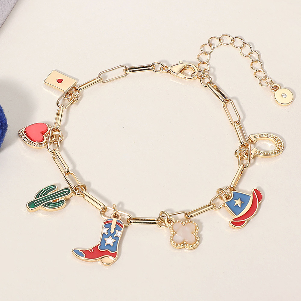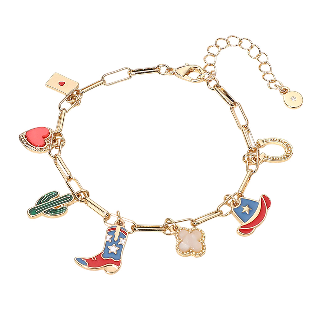 Enamel American USA Flag Western Cowboy Boot Hat cactus Heart Horseshoe Quatrefoil Charm Station Bracelet