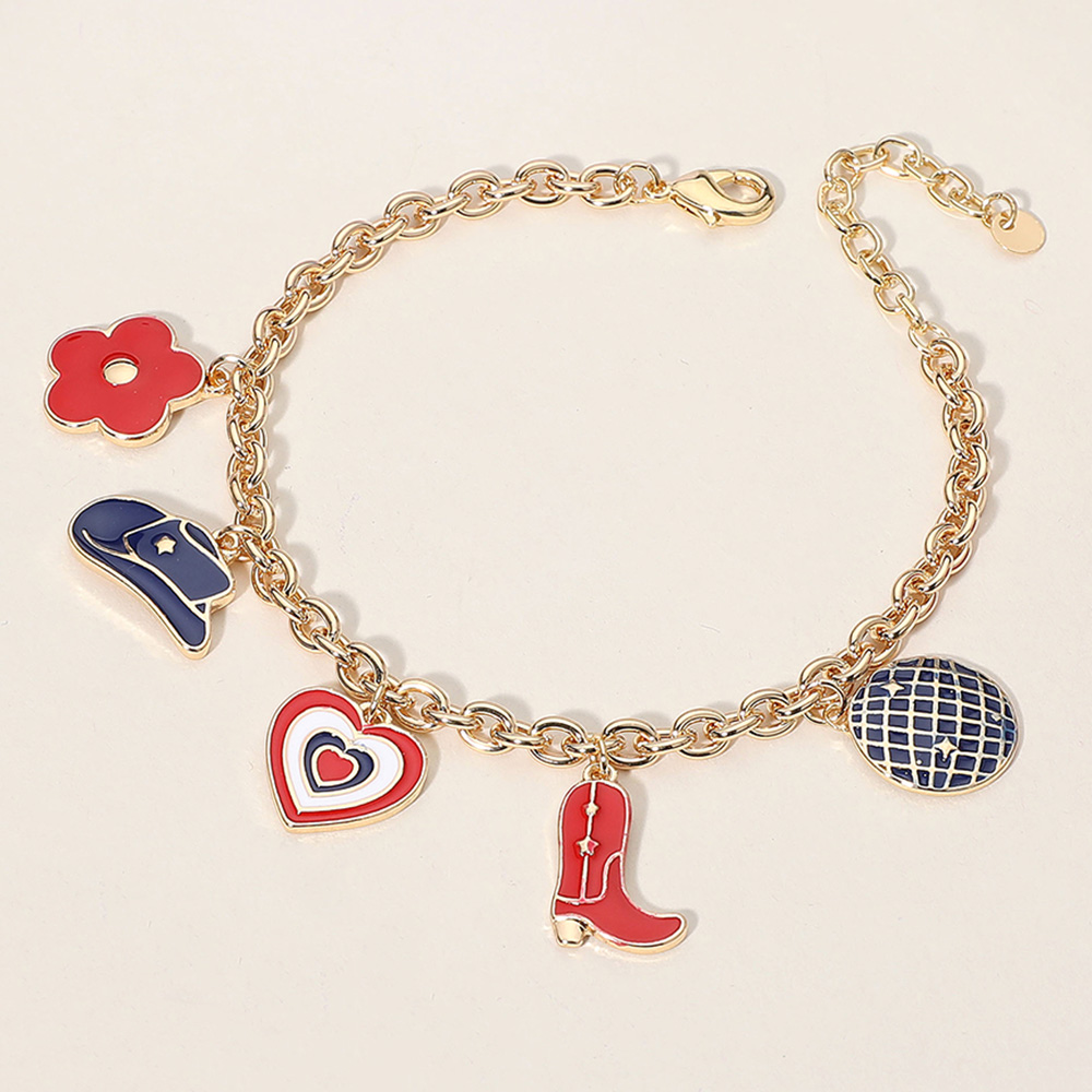 Enamel American USA Western Cowboy Boot Hat Heart Flower Charm Station Bracelet