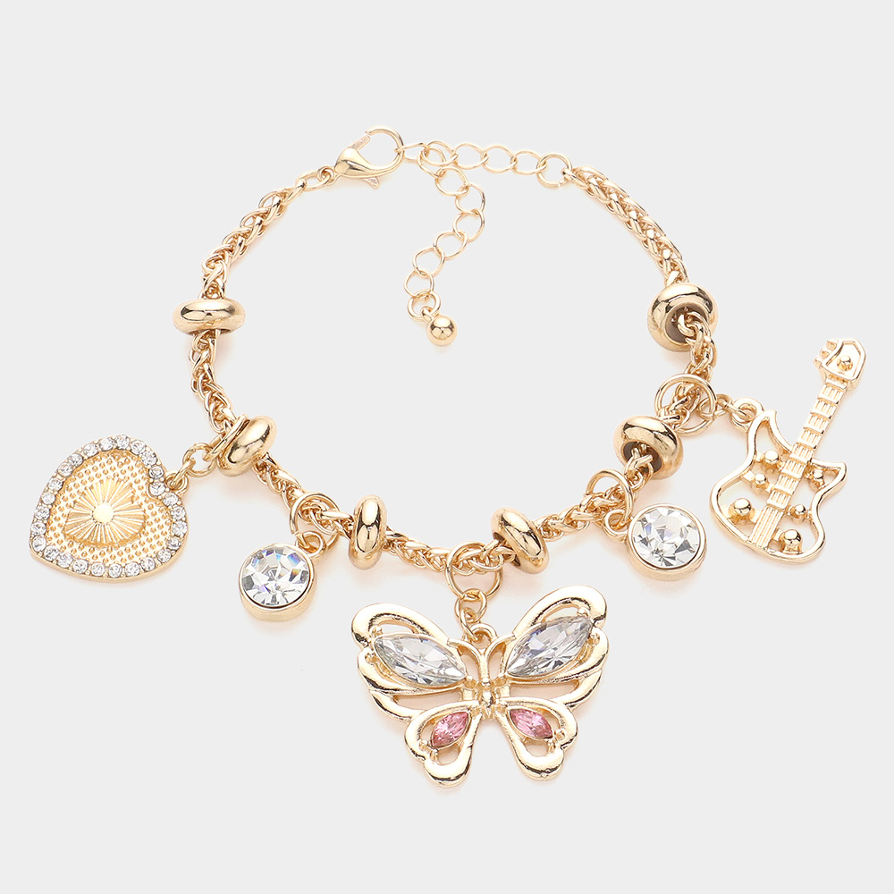 Glass Stone Pointed Heart Butterfly Guitar Charm Bracelet
