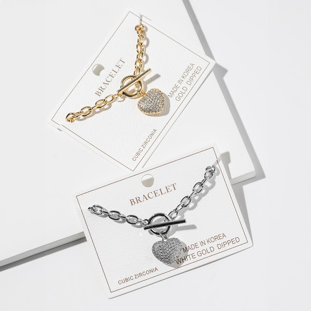 • A chic link bracelet featuring a shimmering heart charm adorned with cubic zirconia for added radiance. This elegant toggle-chain design offers a polished, stylish finish perfect for dressing up any look or adding everyday glamour. Ideal for layered styling or as a statement piece, it delivers classic charm with a modern twist.