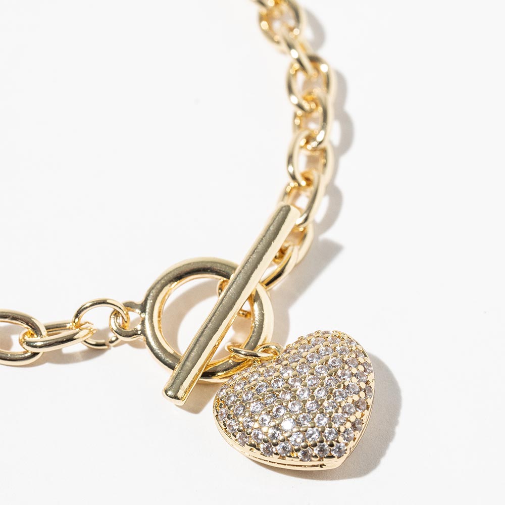 Gold Dipped CZ Stone Paved Heart Toggle Charm Chain Bracelet