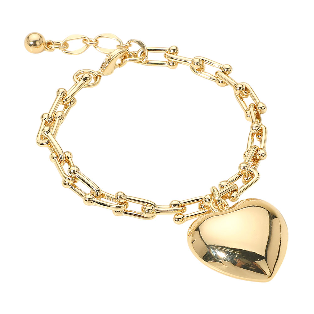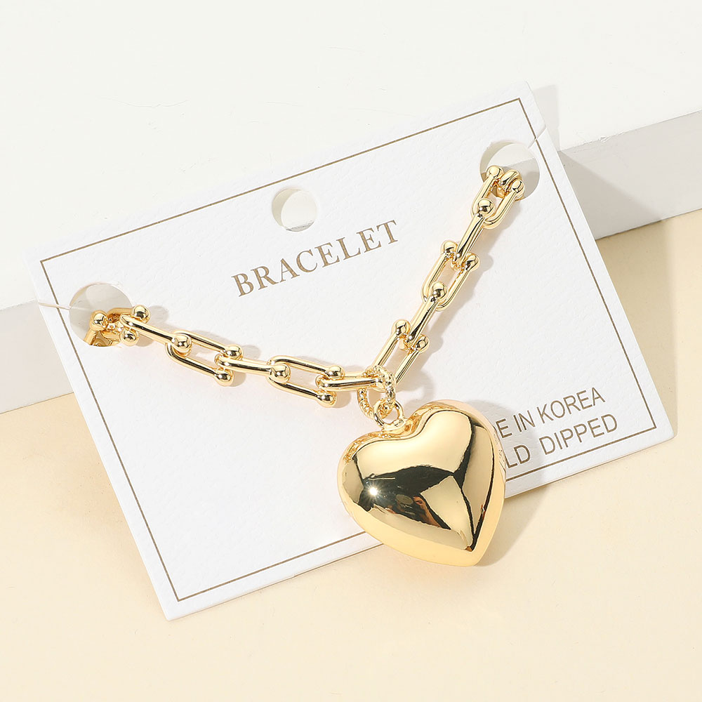 Details • Size : 0.25" H, 7" + 1.75" L • Lobster Clasp Closure • Discover the perfect blend of elegance and modern style with this bold chain bracelet featuring a statement heart charm. Adjustable for a comfortable fit, ideal for both casual and special occasions. • Gold Dipped • Lead and Nickel Compliant • Made In Korea