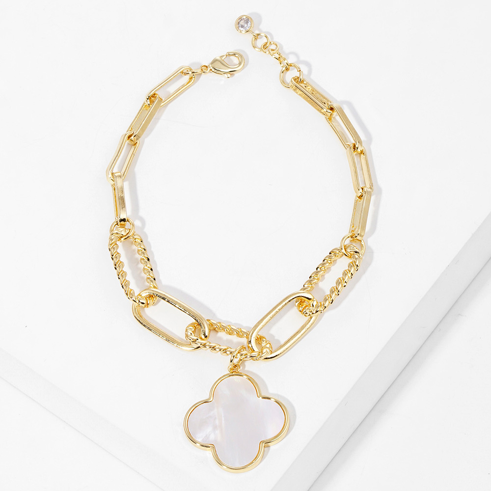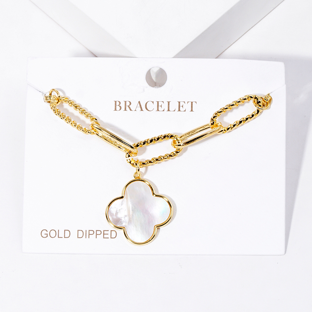 Details • Size : 0.8" X 0.8", 7.25" + 0.5" L • Lobster Clasp Closure • Elevate your style with this gold dipped bracelet featuring a bold red clover charm, designed for a chic and timeless look. Perfect for layering or wearing solo, this bracelet blends classic elegance with a modern touch, making it a versatile accessory for everyday wear or special occasions. • Lead and Nickel Compliant • Made In Korea • Gold Dipped