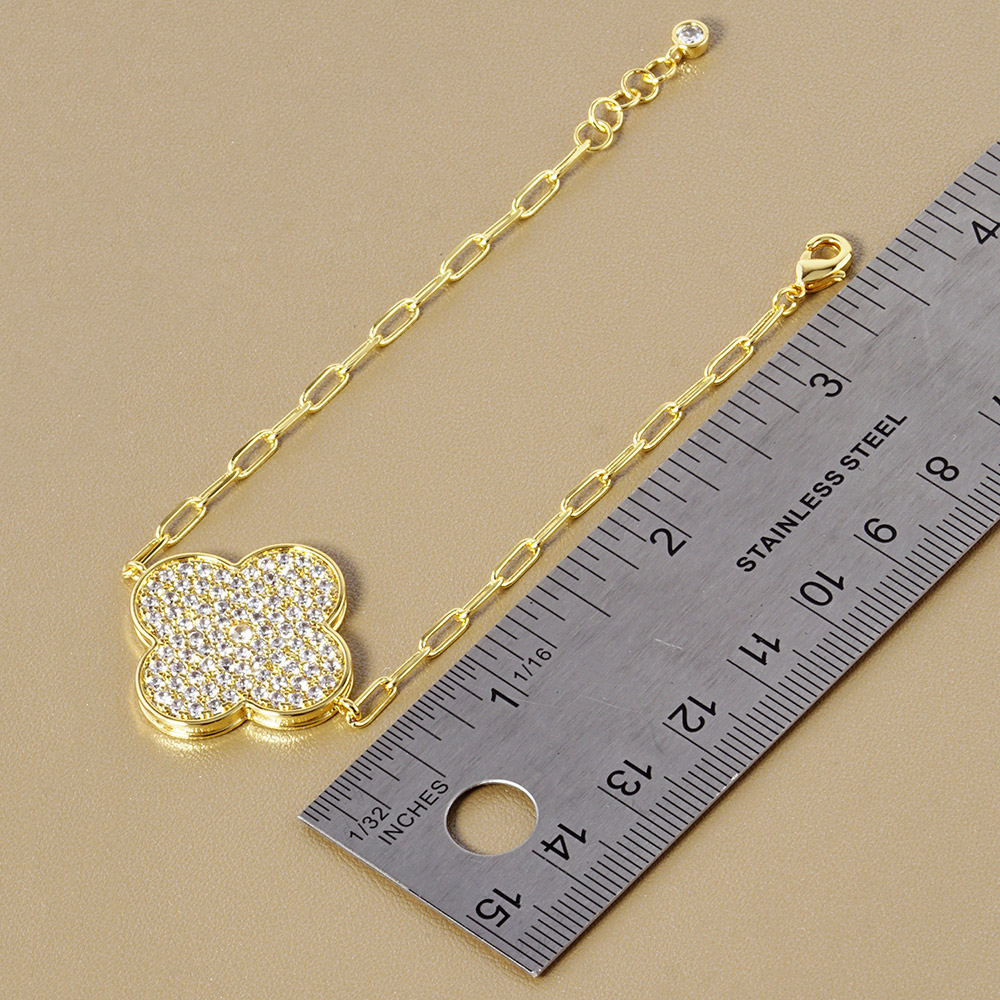 White Gold Dipped Stone Paved Quatrefoil Charm Pointed Paperclip Chain Bracelet