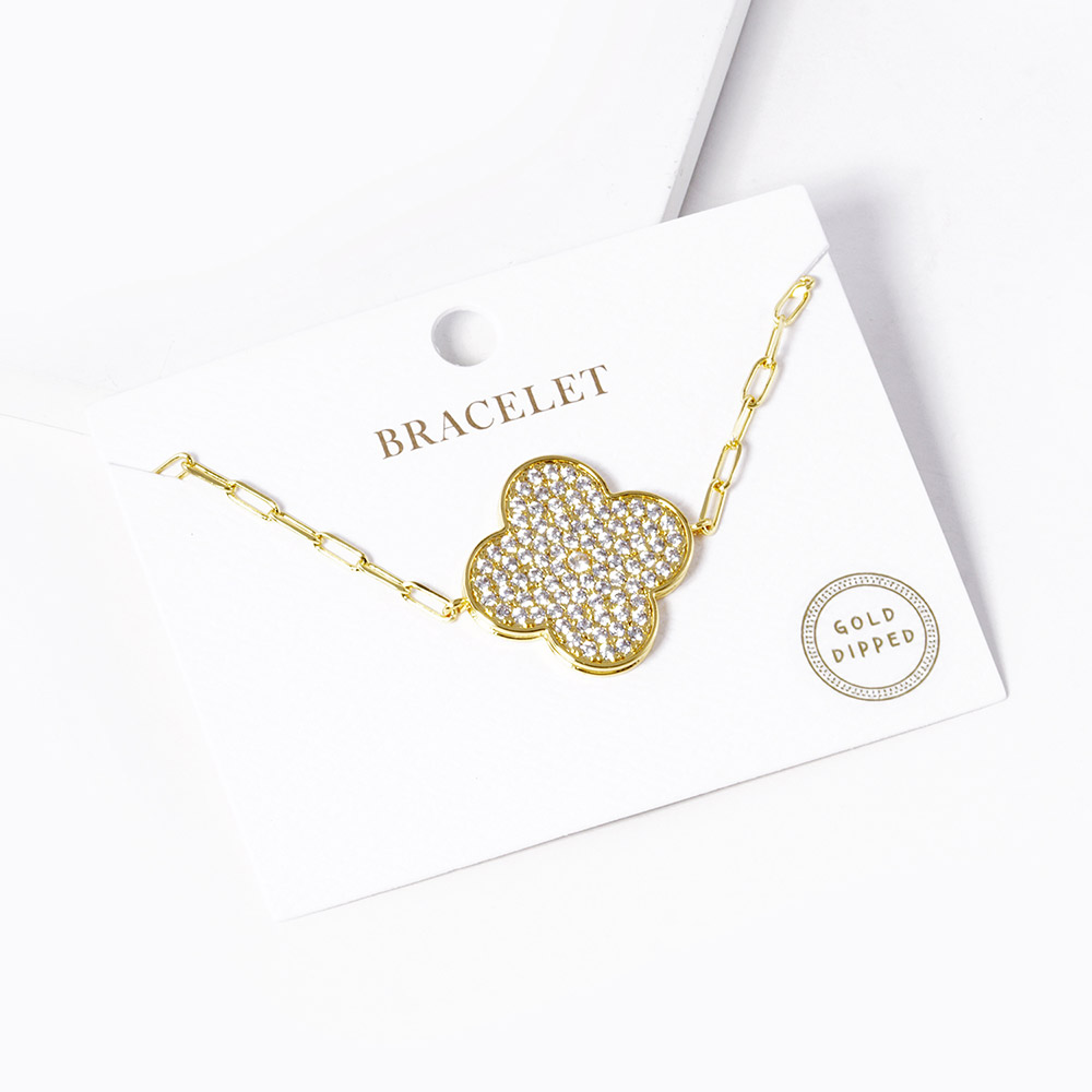 Details • Size : 0.1" H, 7" + 0.5" L • Lobster Closure • Add a touch of elegance with this clover charm link bracelet, featuring a shimmering textured pendant and refined chain design. Perfect for everyday wear or special occasions, offering a timeless and versatile style to elevate your accessory collection. • Lead and Nickel Compliant • Made In Korea • Gold Dipped