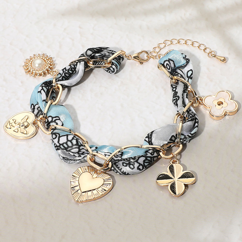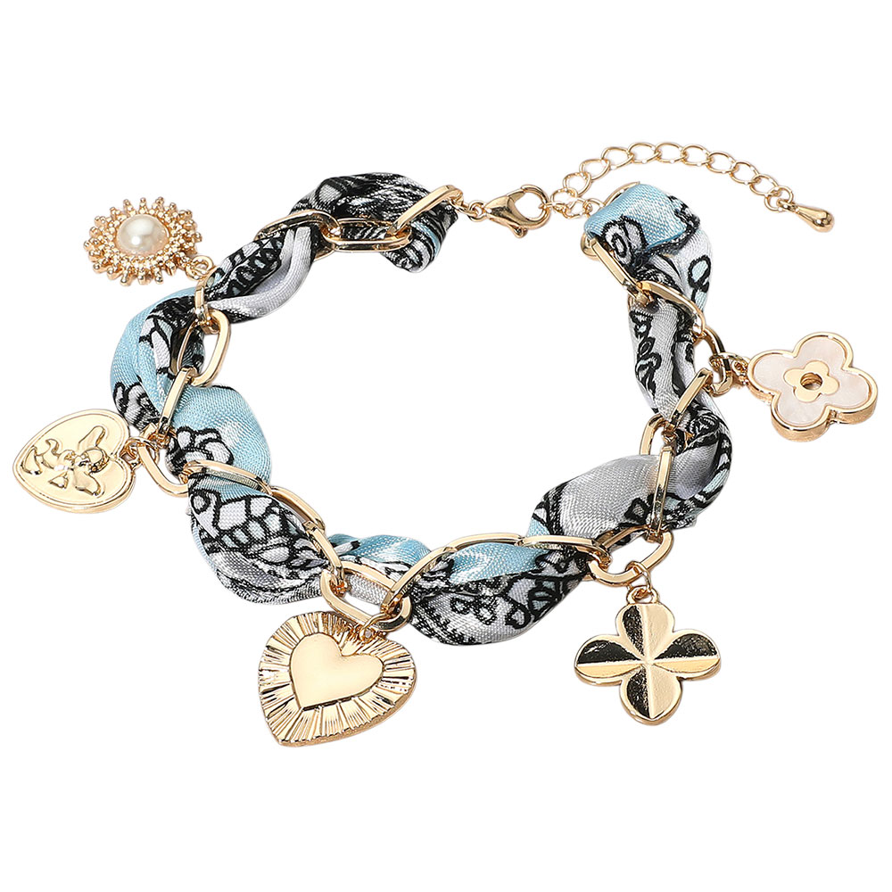 Details • Size : 1.25" H, 7" + 2" L • Lobster Clasp Closure • Stylish scarf-style bracelet with a gold-tone chain woven through patterned fabric, adorned with heart, quatrefoil, and floral-inspired charms. Features intricate detailing and a touch of pearl accent, making it a versatile accessory that blends elegance with playful charm. • Lead and Nickel Compliant