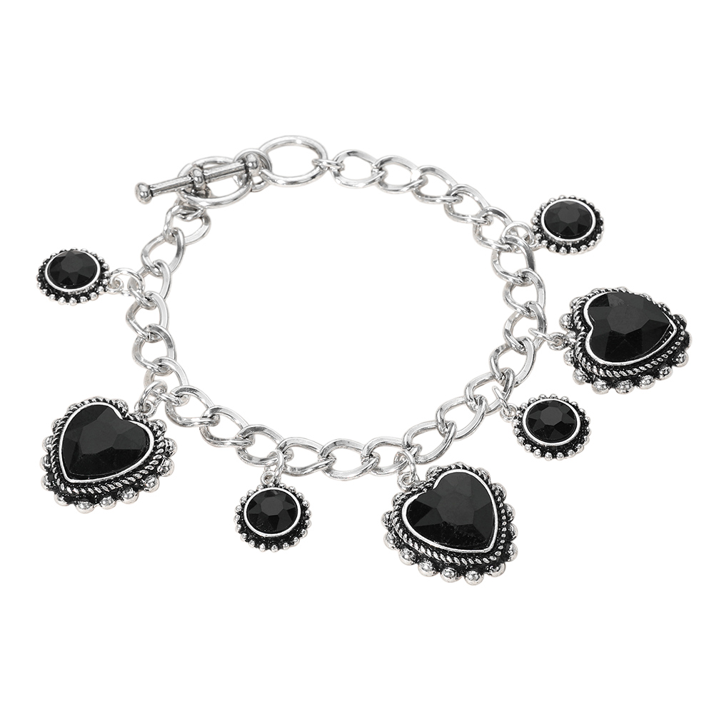 Details • Size : 1.25" H, 7.5" + 1" L • Toggle Closure • This link bracelet features heart and round charms with intricate decorative borders, creating a bold statement piece. The toggle clasp ensures secure wear while the classic design adds a touch of vintage-inspired charm to any outfit. • Lead and Nickel Compliant