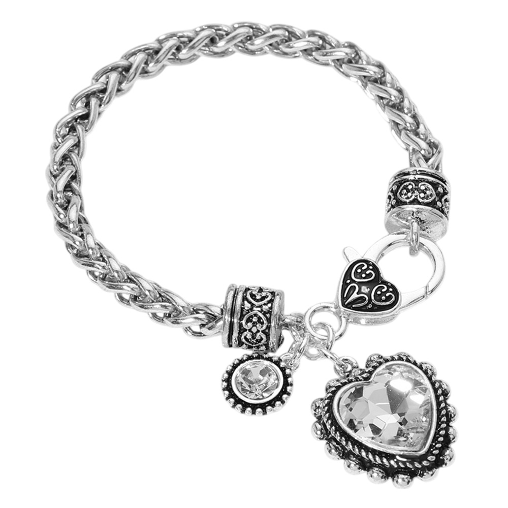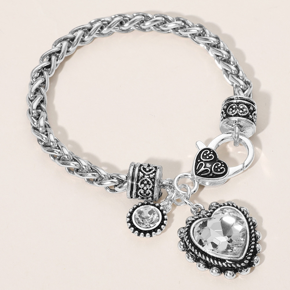 Details • Size : 7.5" L • Charm Size : 1.25" L • Lobster Clasp Closure • This bracelet showcases a braided chain adorned with a heart charm and sparkling accents. Intricate details and a secure clasp add elegance and durability, making it a perfect accessory for everyday charm or special occasions. • Lead and Nickel Compliant