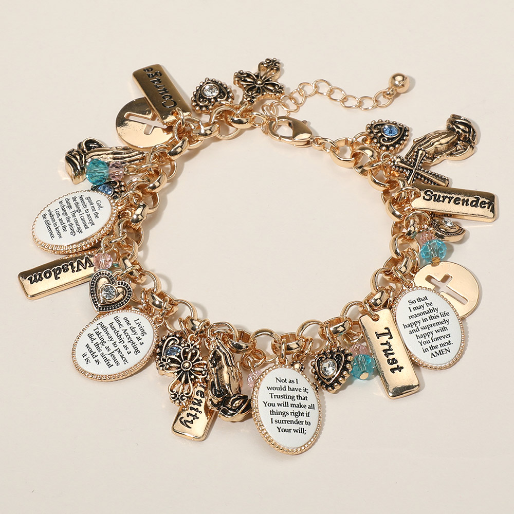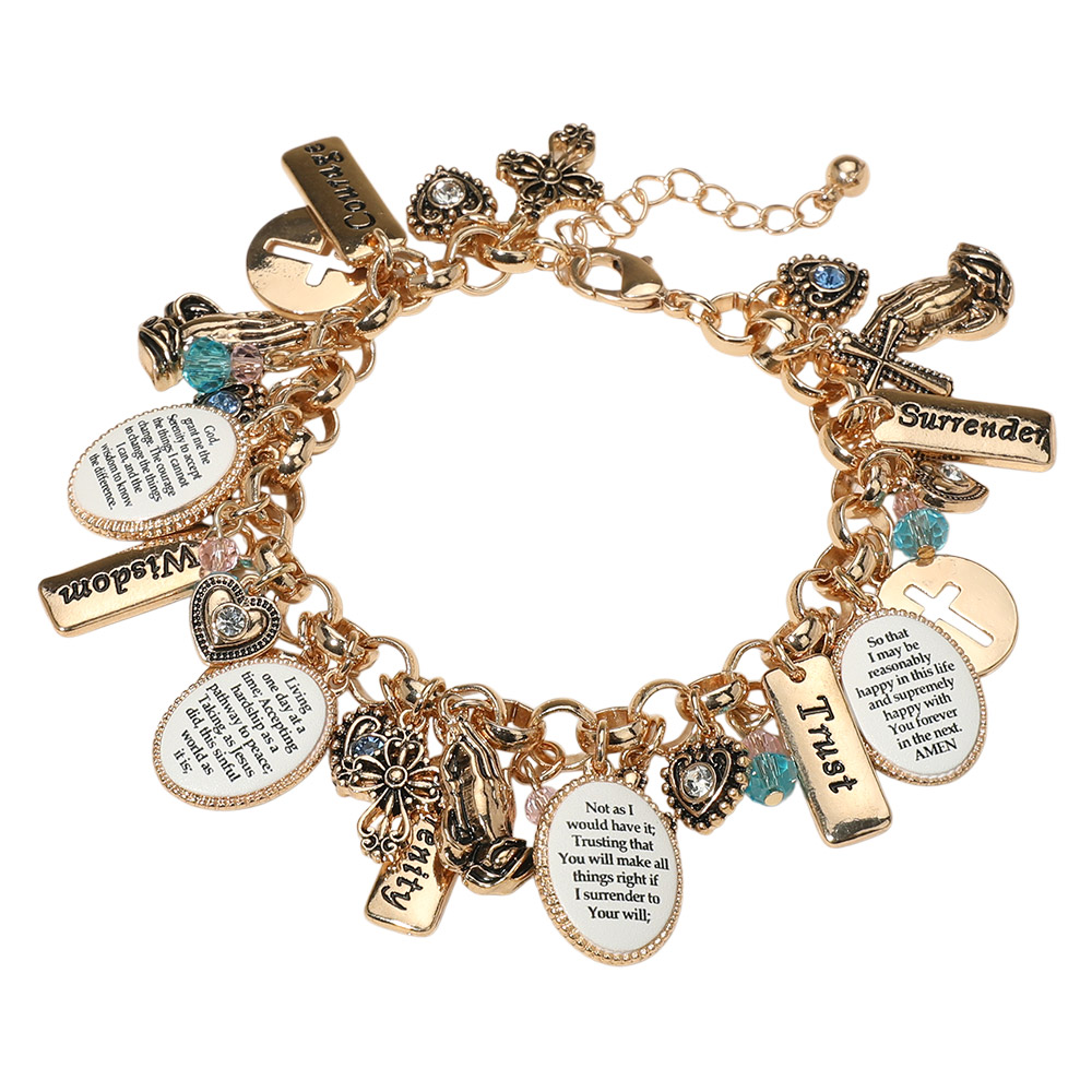 • Meaningful charm bracelet adorned with engraved faith messages, religious symbols, and decorative beads. A thoughtful accessory for spiritual encouragement and everyday inspiration.