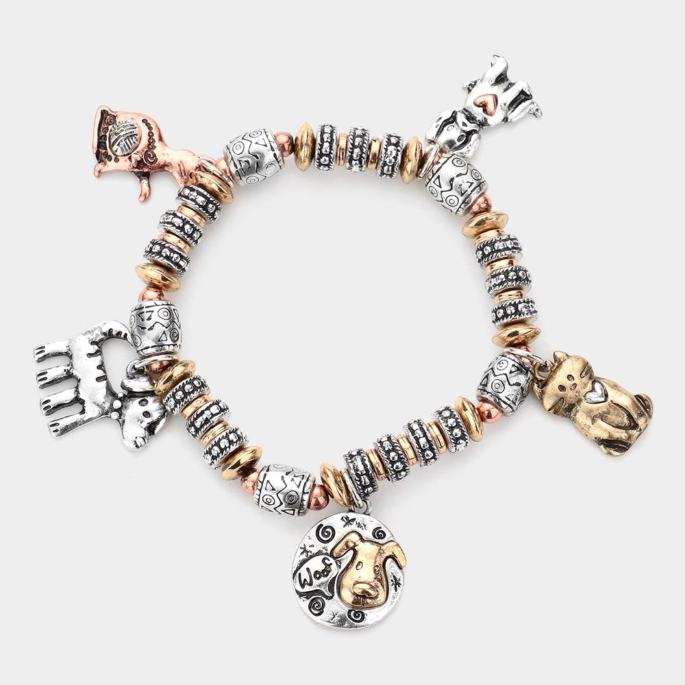 Metal Cat Dog Charm Station Stretch Bracelet