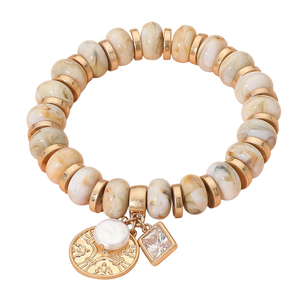 Details • Size : 0.5" H • Charm Size : 0.8" X 0.8" • Stretchable • This beaded stretch bracelet features polished round beads accented with metallic spacers and finished with charming pendants, including a coin, pearl, and crystal detail. Its versatile design makes it a stylish piece for layering or wearing solo for a chic statement. • Lead and Nickel Compliant