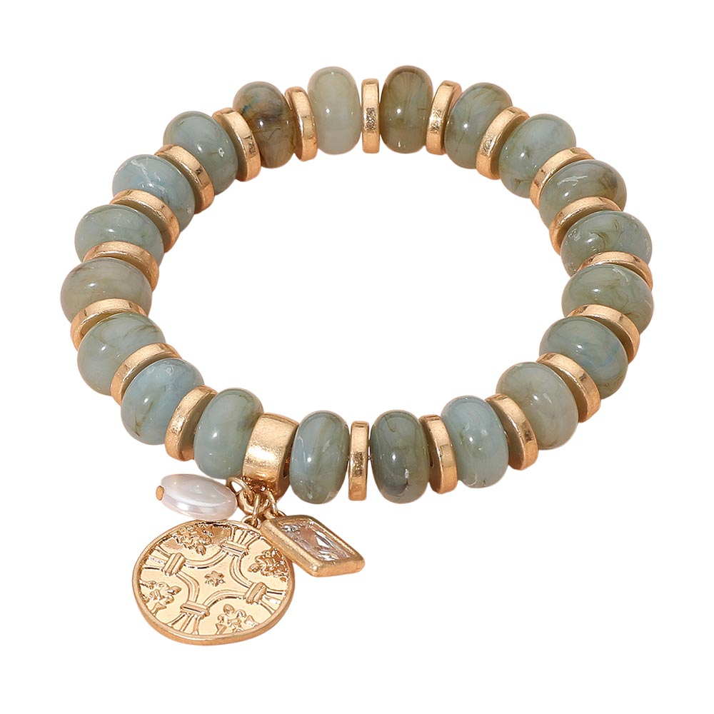 Details • Size : 0.5" H • Charm Size : 0.8" X 0.8" • Stretchable • This beaded stretch bracelet features polished round beads accented with metallic spacers and finished with charming pendants, including a coin, pearl, and crystal detail. Its versatile design makes it a stylish piece for layering or wearing solo for a chic statement. • Lead and Nickel Compliant