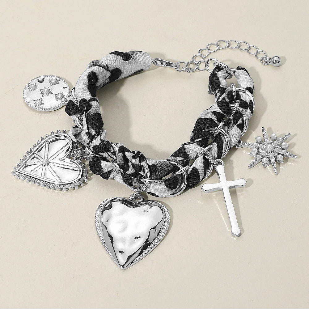 Details • Size : 0.7" H, 6.5" + 2.5" L • Charm Size : 1.25" L • Lobster Clasp Closure • This charm bracelet features bold pendants including hearts, stars, and a cross, woven into a braided fabric and chain design. A unique accessory that blends texture and symbolism for standout everyday or occasion wear. • Lead and Nickel Compliant
