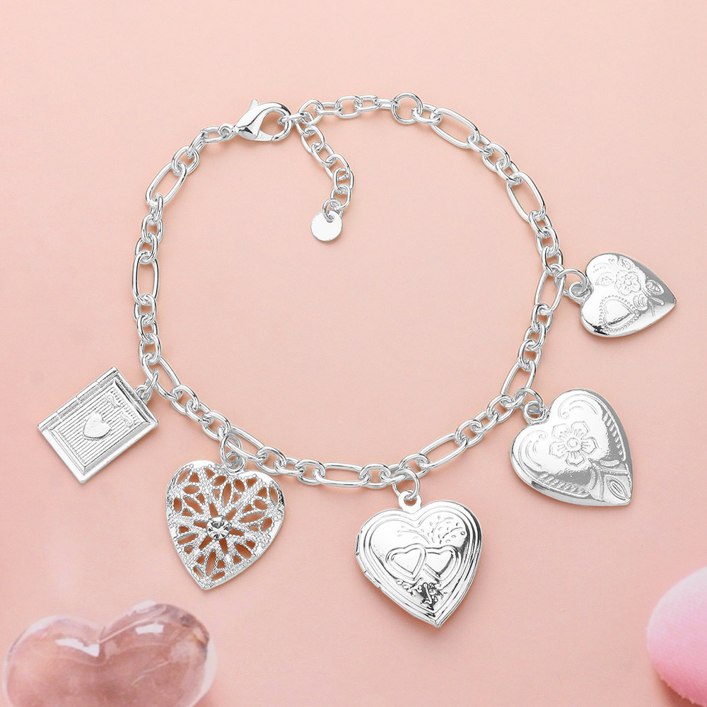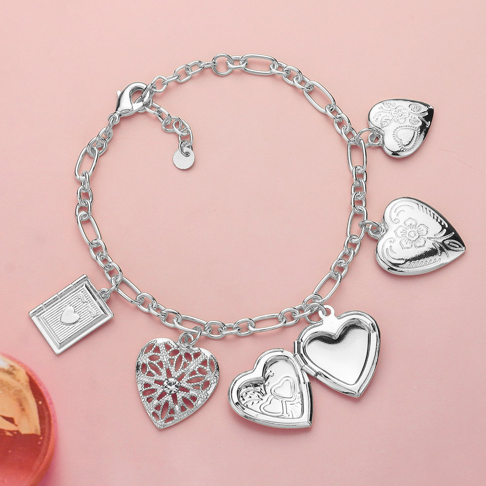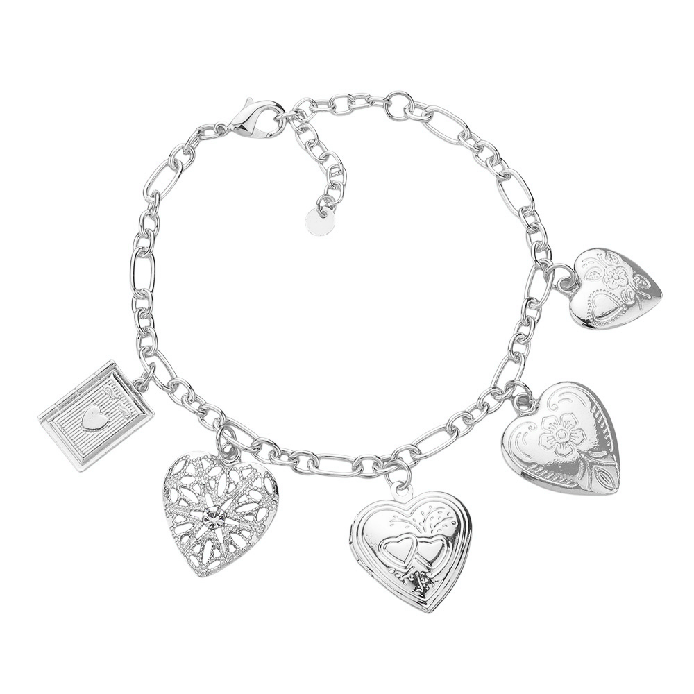 Metal Heart Locket Charm Station Paperclip Chain Bracelet