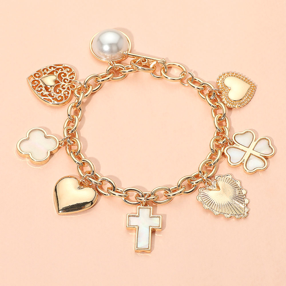 Metal Heart Pearl Clover Cross Charm Station Bracelet
