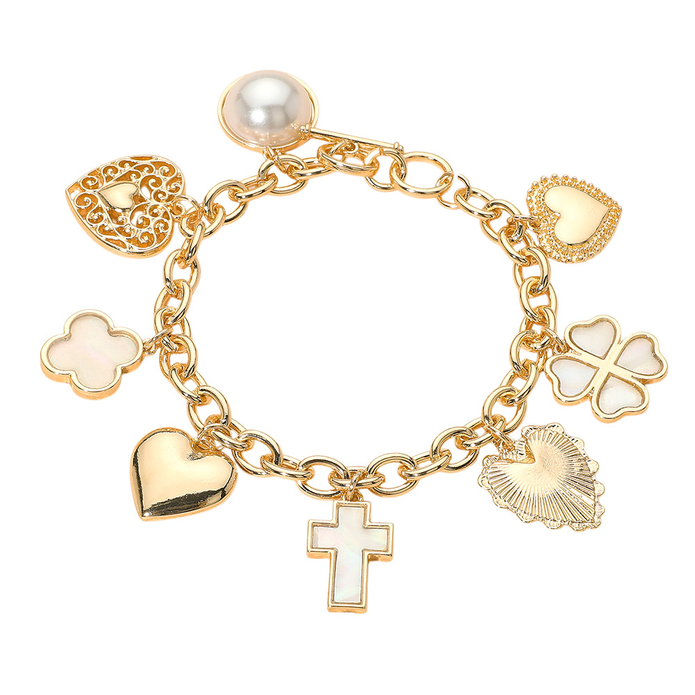 Details • Size : 1.25" H, 7.75" + 1" L • Lobster Clasp Closure • Elegant charm bracelet adorned with a mix of symbolic charms including hearts, a cross, clovers, and more. Each charm adds a touch of meaning and detail, making this piece a beautiful accessory for daily wear or gifting. Features a secure clasp and graceful design. • Lead and Nickel Compliant