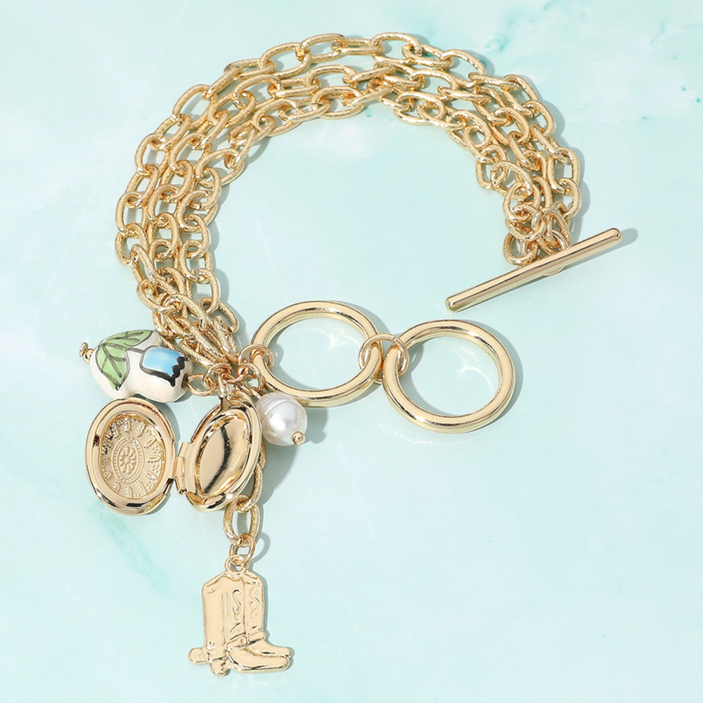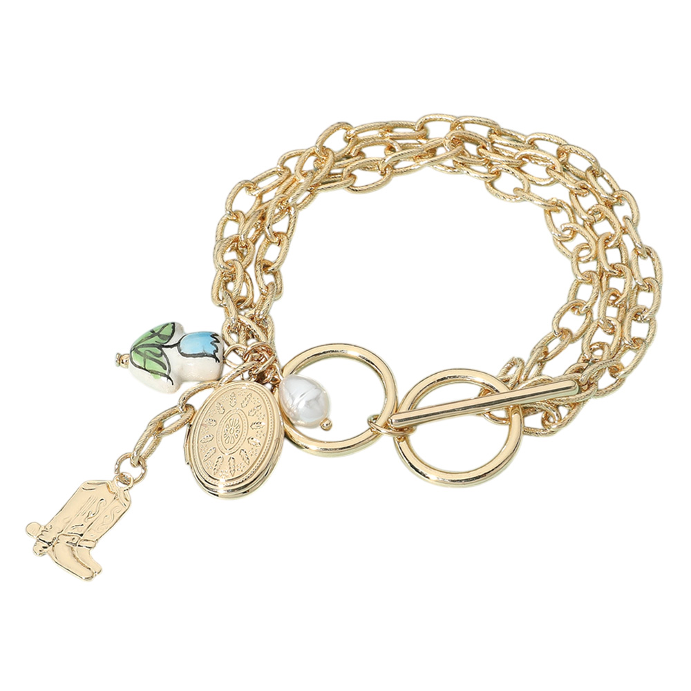 Details • Size : 2" H, 7" + 1.75" L • Toggle Closure • Elegant double-layered gold bracelet featuring a floral bead charm, engraved coin, and toggle clasp. A stylish and versatile accessory perfect for elevating any casual or dressy look. • Lead and Nickel Compliant
