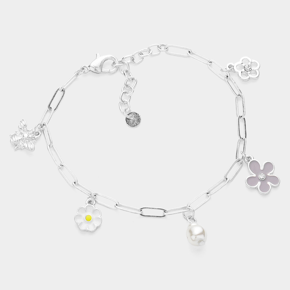 Pearl Enamel Flower Metal Honey Bee Charm Station Bracelet