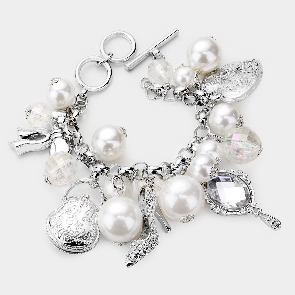 Pearl Metal Bow Bag Stiletto Heel Mirror Heart Charm Toggle Bracelet