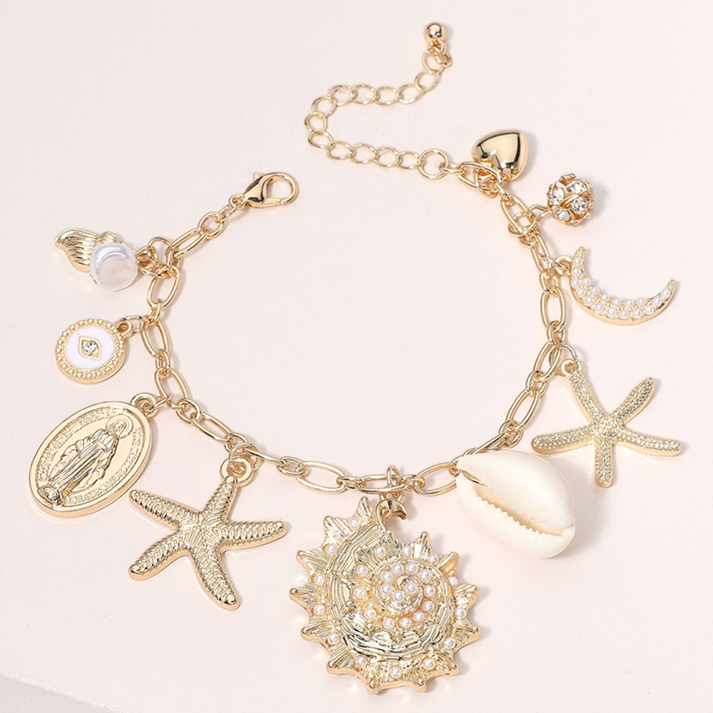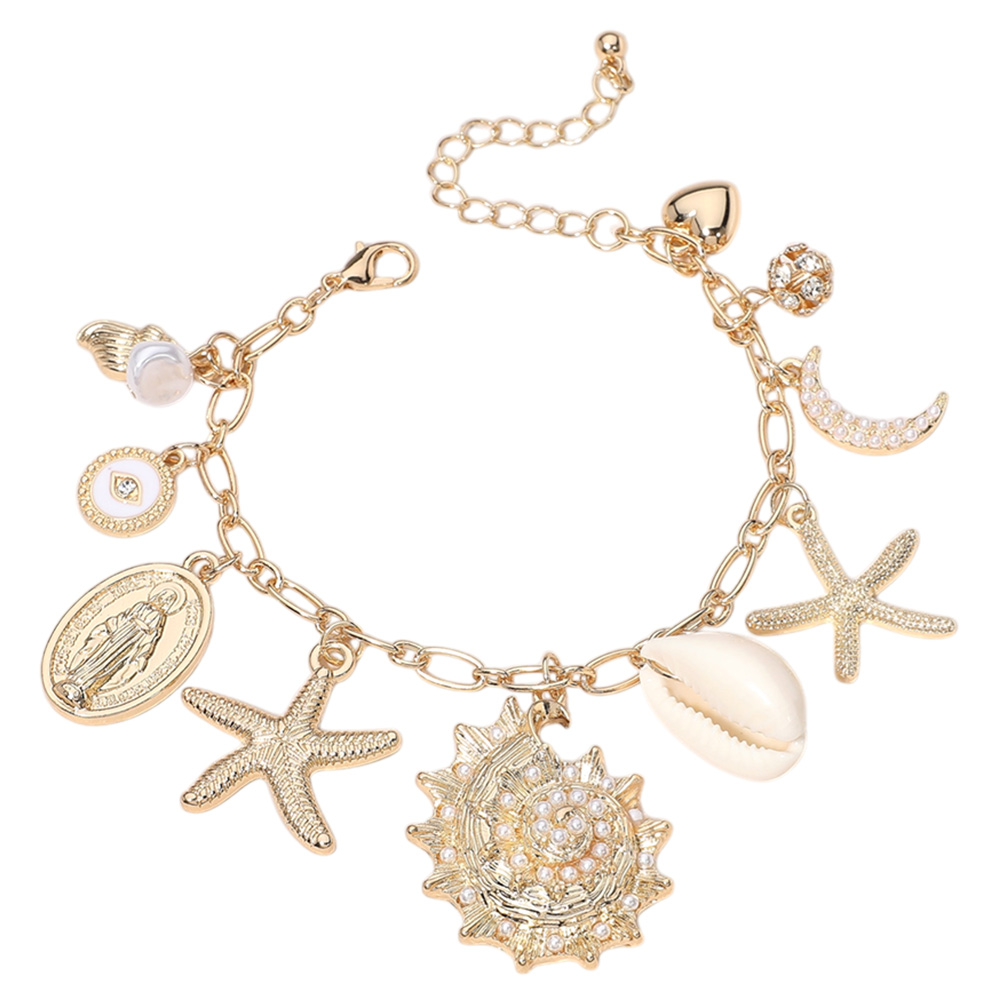 Pearl Paved Shell Crescent Metal Starfish Heart Evil Eye Virgin Mary Charm Station Bracelet