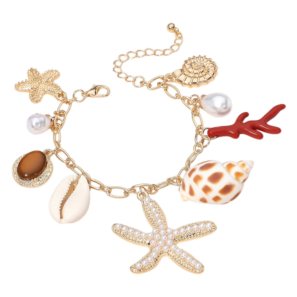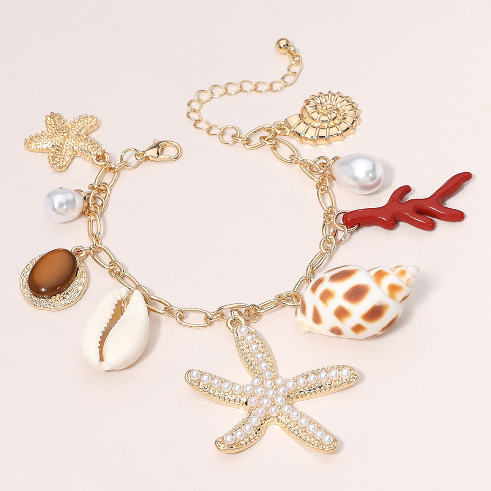 Details • Size : 1.8" H, 7" + 2.5" L • Lobster Clasp Closure • Celebrate seaside elegance with this ocean-inspired charm bracelet, featuring intricate starfish, shell, and coral accents. A perfect accessory for beach lovers looking to add a whimsical marine touch to any outfit. • Lead and Nickel Compliant • Brass