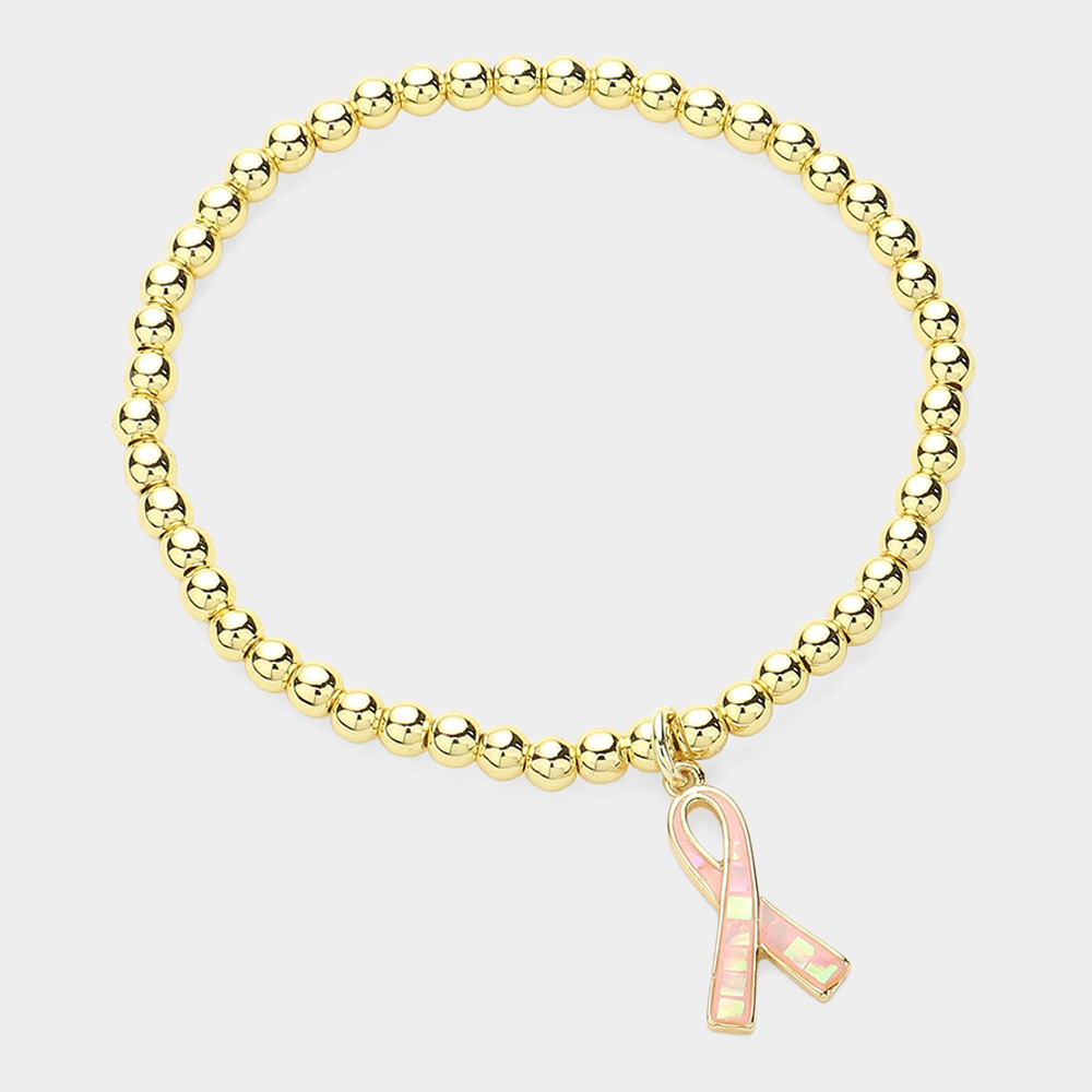 Pink Ribbon Charm Pointed Stainless Steel Ball Beaded Stretch Bracelet