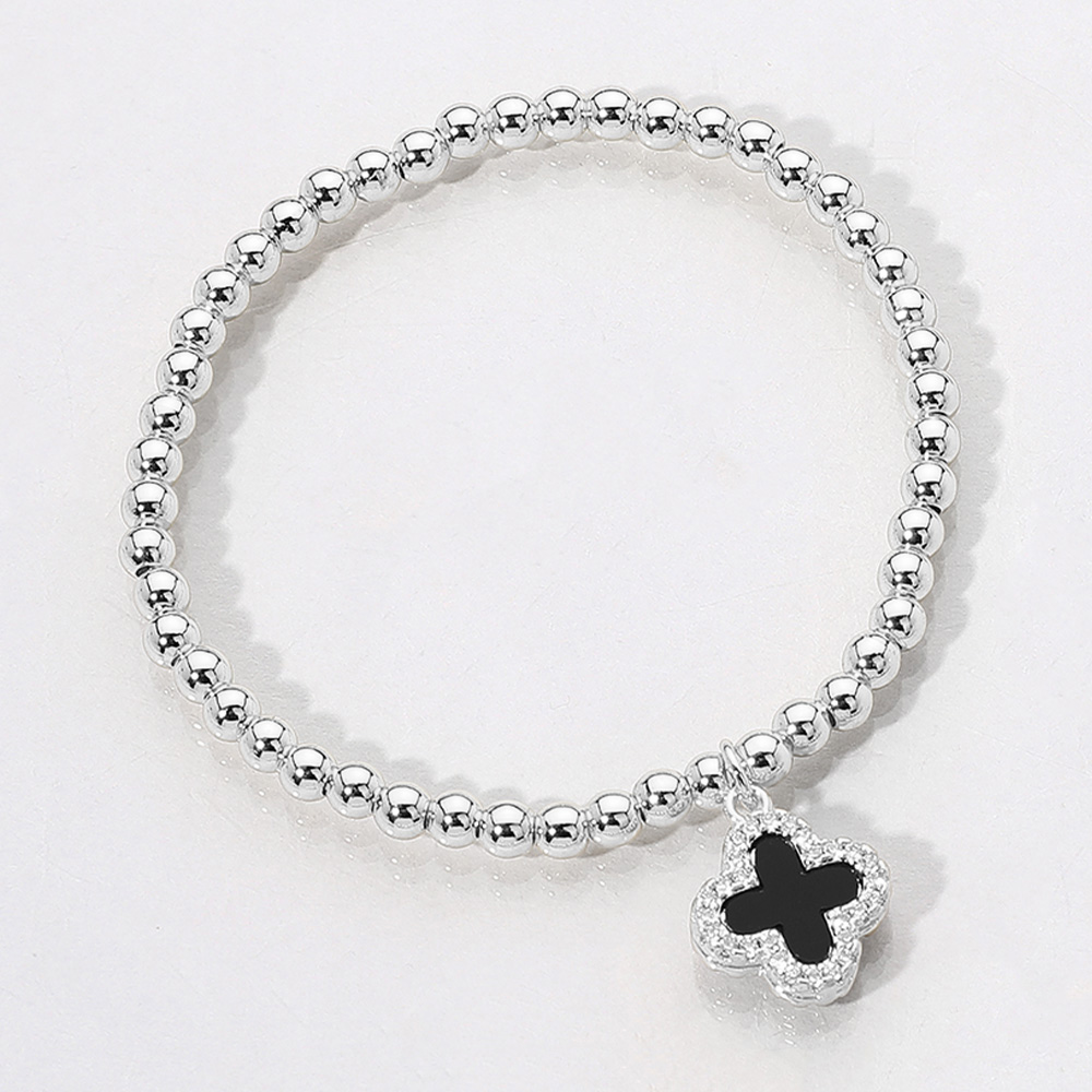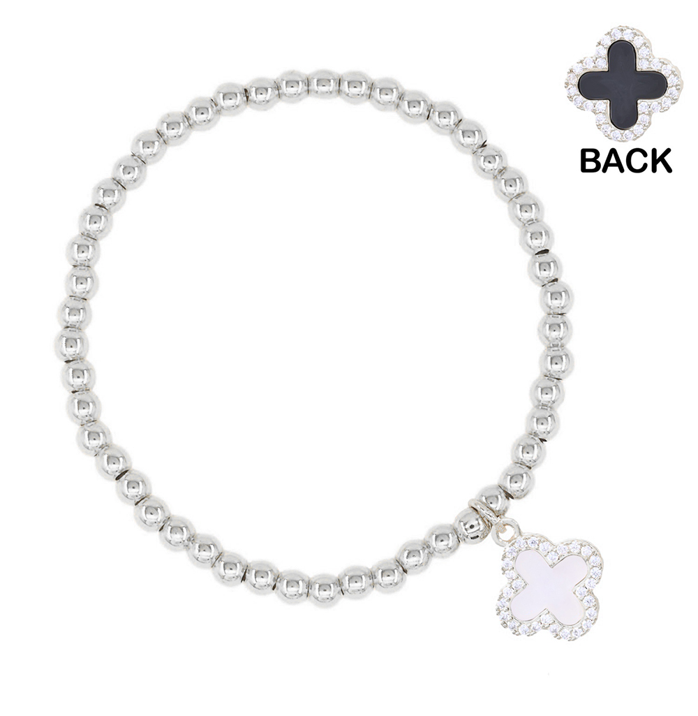 Reversible Stainless Steel Quatrefoil Charm Beaded Stretch Bracelet
