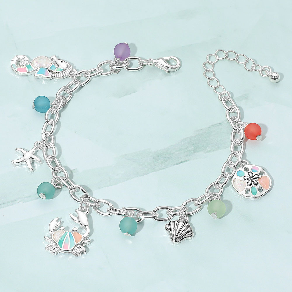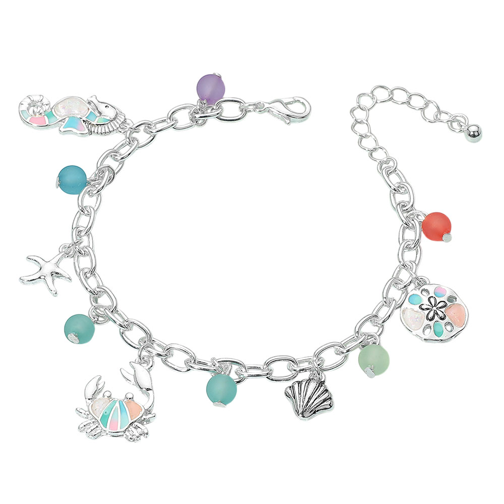 Details • Size : 2" H, 7" + 2" L • Charm Size : 0.9" L • Lobster Clasp Closure • Add a splash of seaside charm to your outfit with this silver ocean-themed charm bracelet. Featuring whimsical sea creatures like a seahorse, starfish, crab, and seashells, along with vibrant matte beads and pastel enamel accents. Adjustable for a comfortable fit—perfect for beach lovers and summer fashion. • Lead and Nickel Compliant