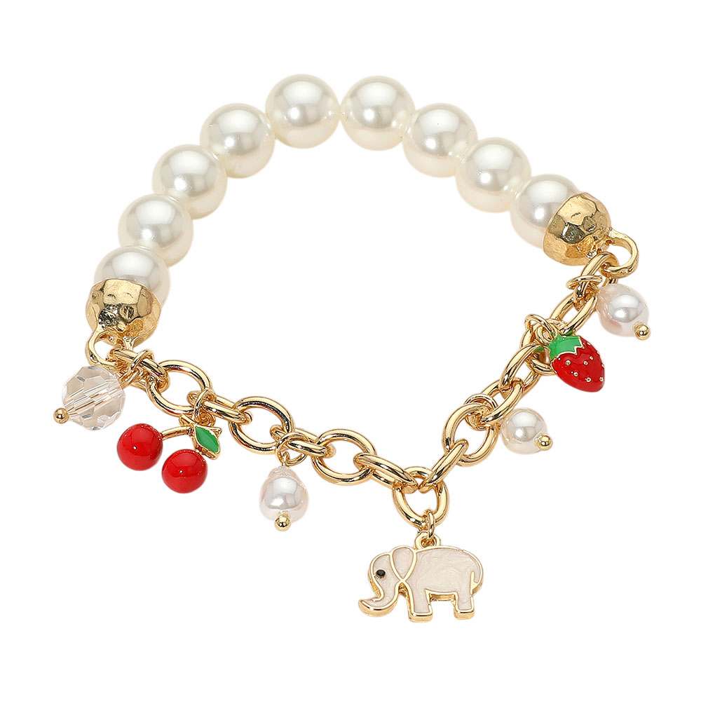 Details • Size : 0.4" H • Charms Size : 0.7" L • Stretchable • Fun and stylish bracelet featuring smooth round beads and playful charms including an elephant, cherries, and strawberry. A whimsical accessory that adds charm and personality to your everyday look. • Brass