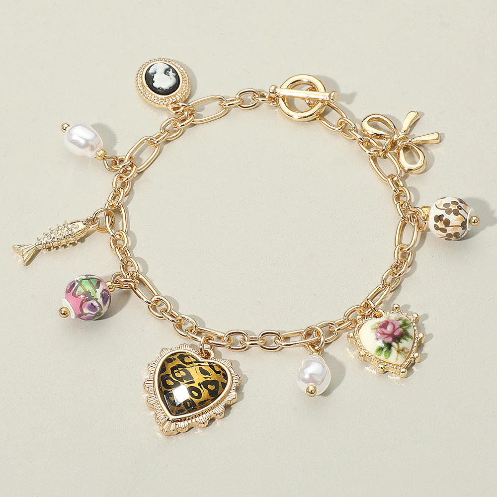 Details • Size : 0.2" H, 6.75" + 0.4" L • Charm Size : 1" L • Toggle Closure • Elegant charm bracelet adorned with an eclectic mix of motifs, including hearts, floral accents, pearls, and whimsical shapes. Features intricate detailing for a timeless, collectible accessory that adds character to any look. • Brass